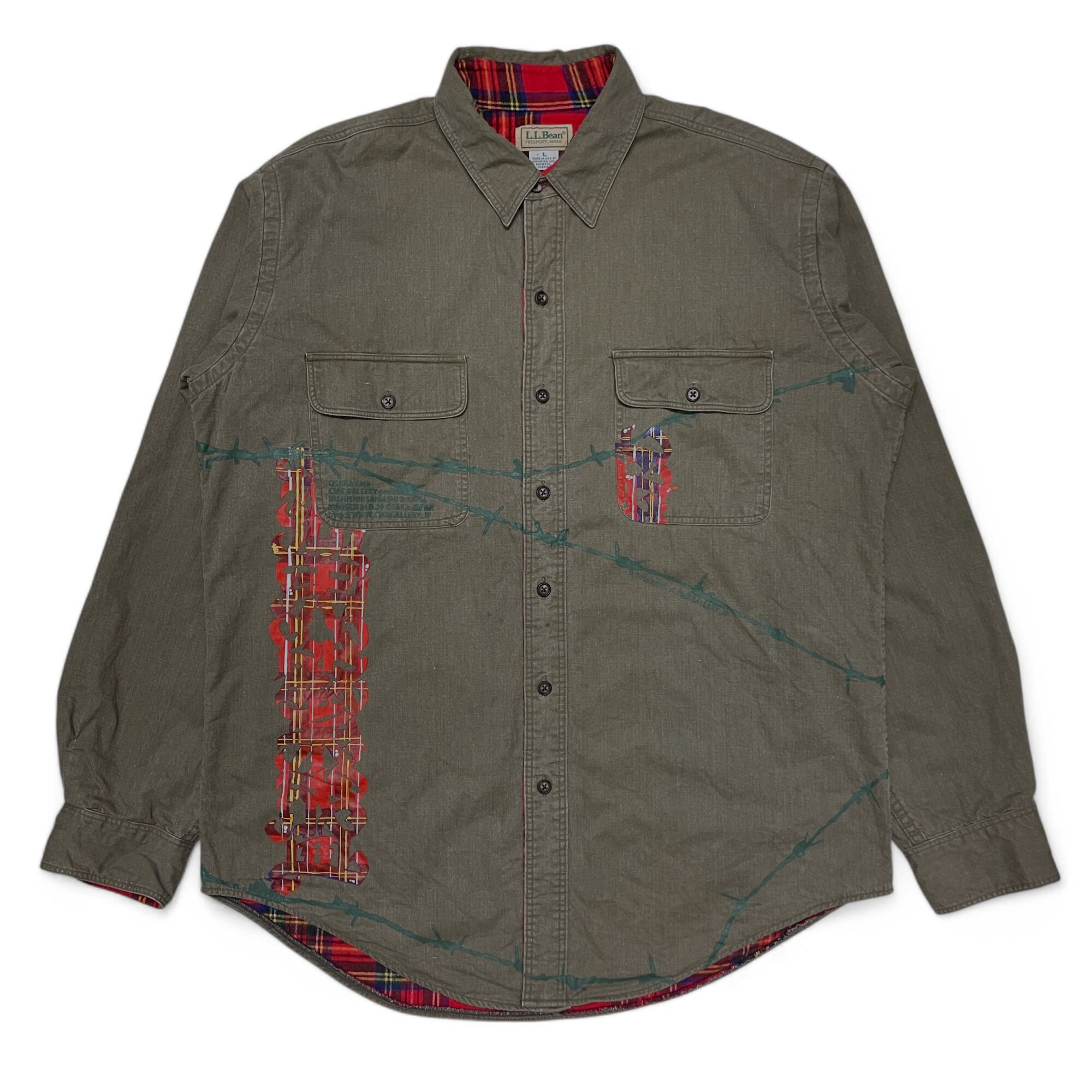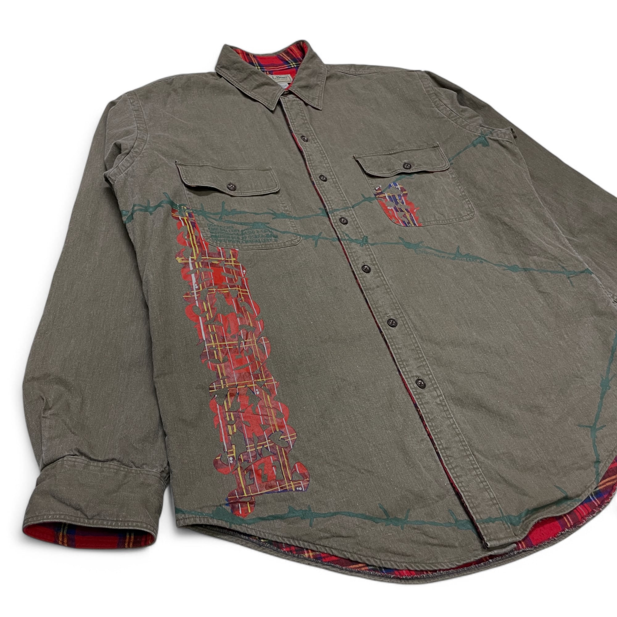 Usedの裏地がチェック柄のジャケット全体に有刺鉄線をプリントし、Casperの”商売繁盛”のレタリングをチェック柄にプリントした唯一無二な1着。