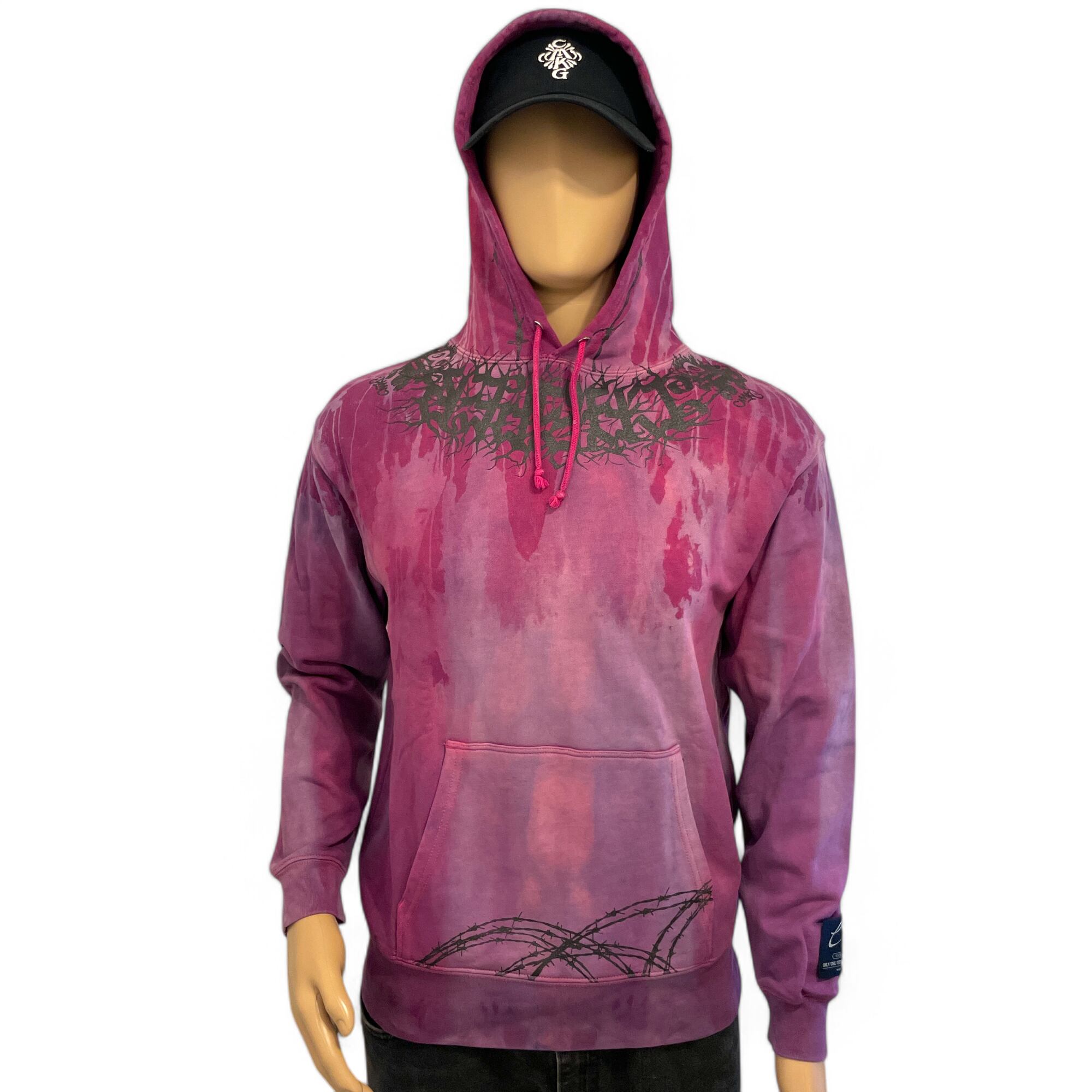 紫とピンクでドリップ柄に染めたパーカーに前面はCasperのWoodレタリングを基調としたカスタムプリント、背面には2025のMasterPieceをプリントした1着。