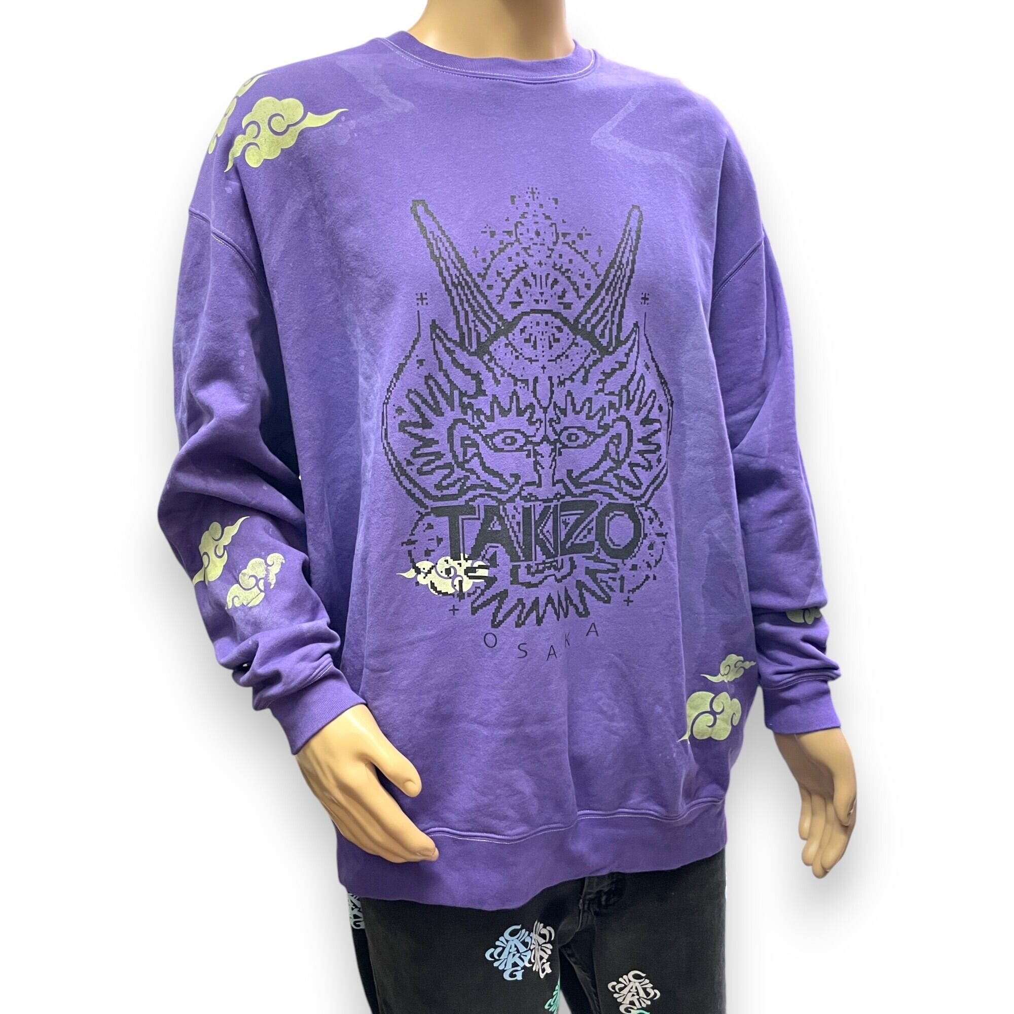 パープルに染色加工を施したパイル生地のスウェットにバランスよく雲柄をプリントし、
