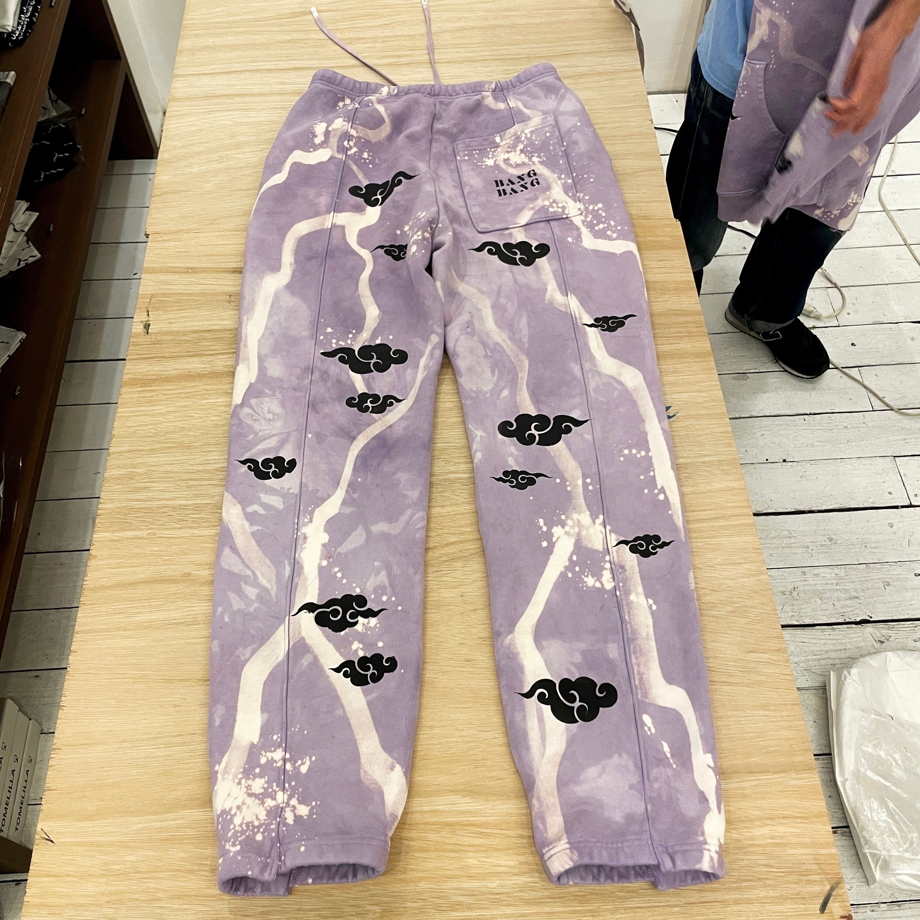 染色と雷模様のブリーチ加工を施し、Takizoデザインの雲を全身にプリント。