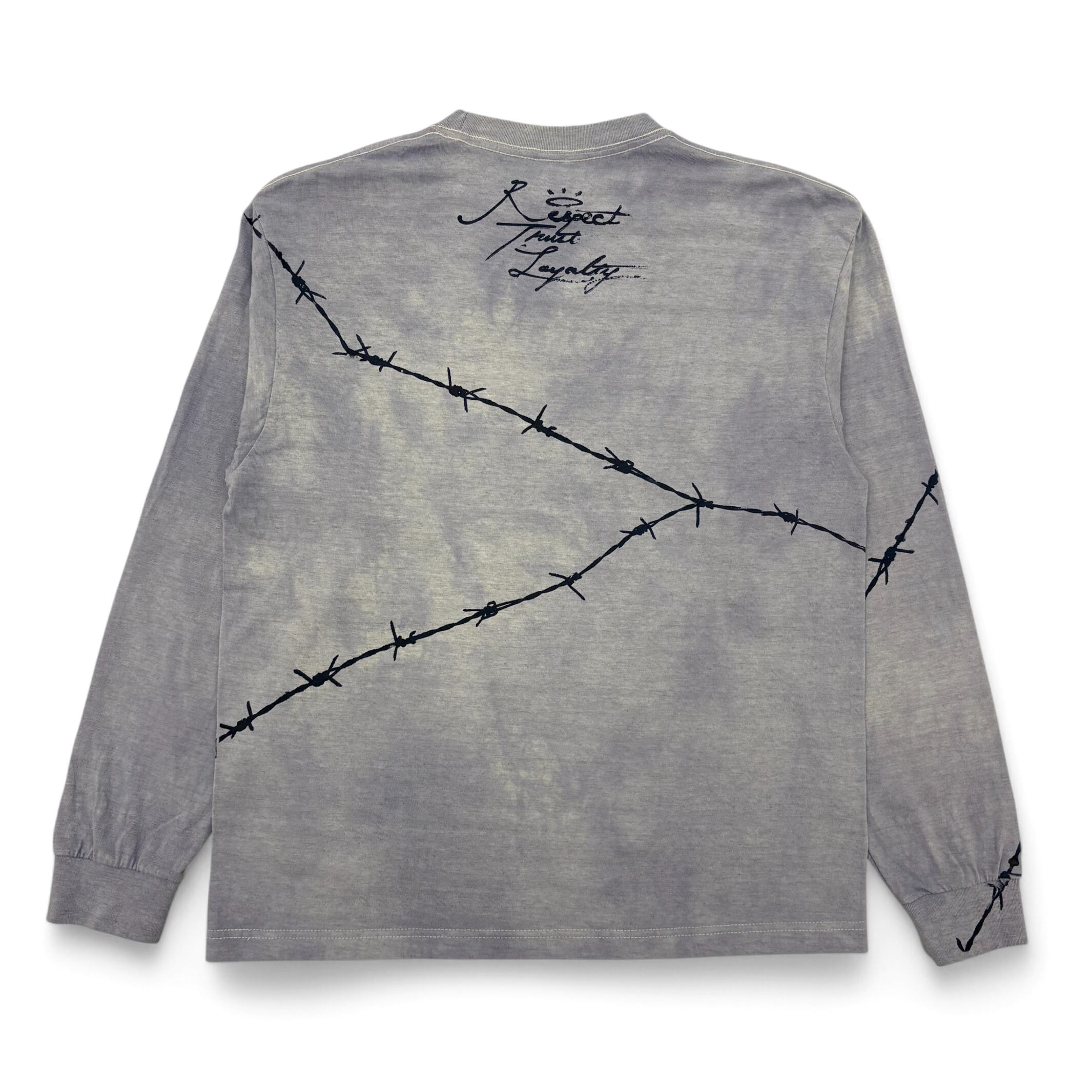 バック首元には「Respect Trust Loyality」、全体に有刺鉄線を落とし込んだ1着。