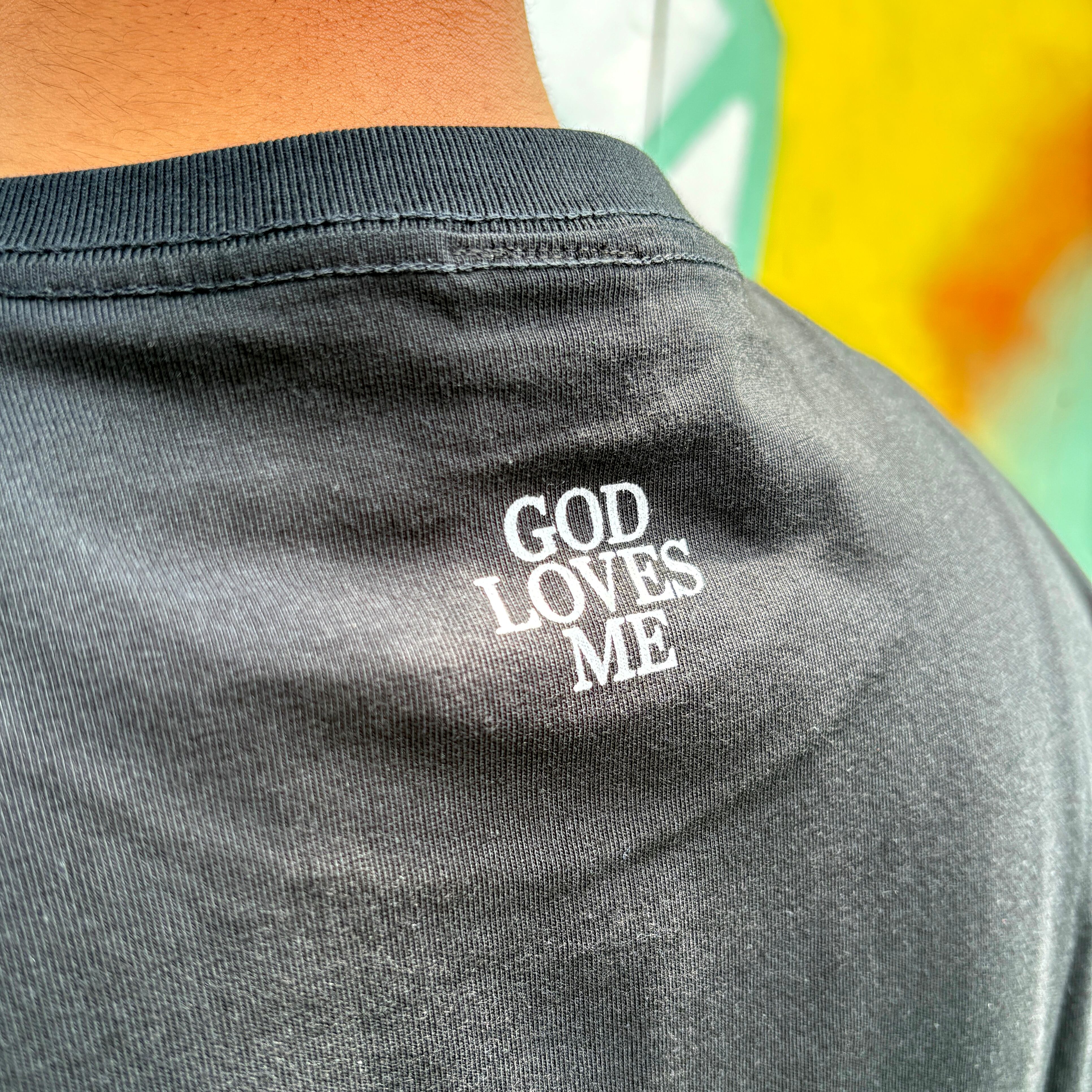 左胸に発泡仕様のロゴプリントと背面首元に"GOD LOVES ME"とプリントされています。