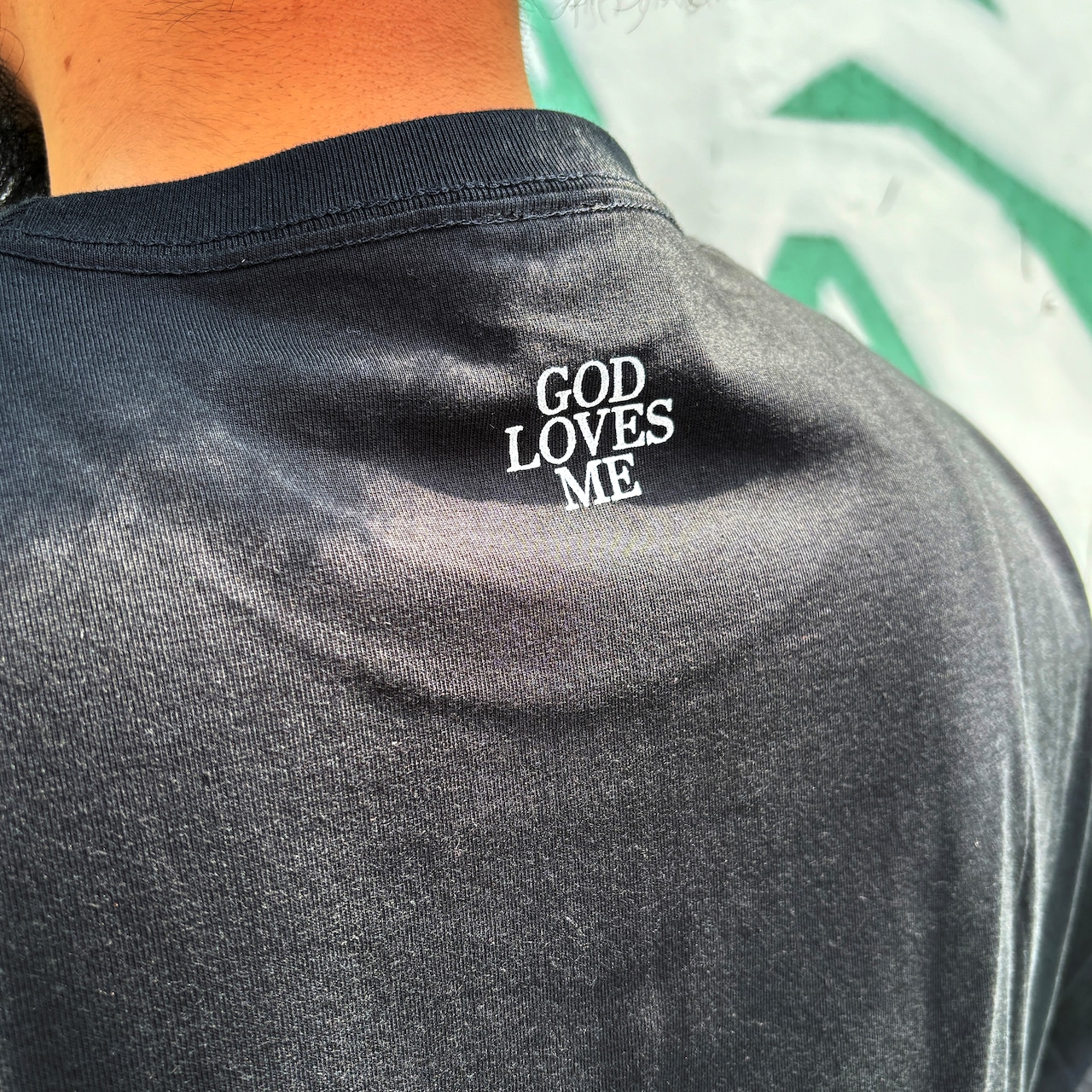 左胸に発泡仕様のロゴプリントと背面首元に"GOD LOVES ME"とプリントされています。