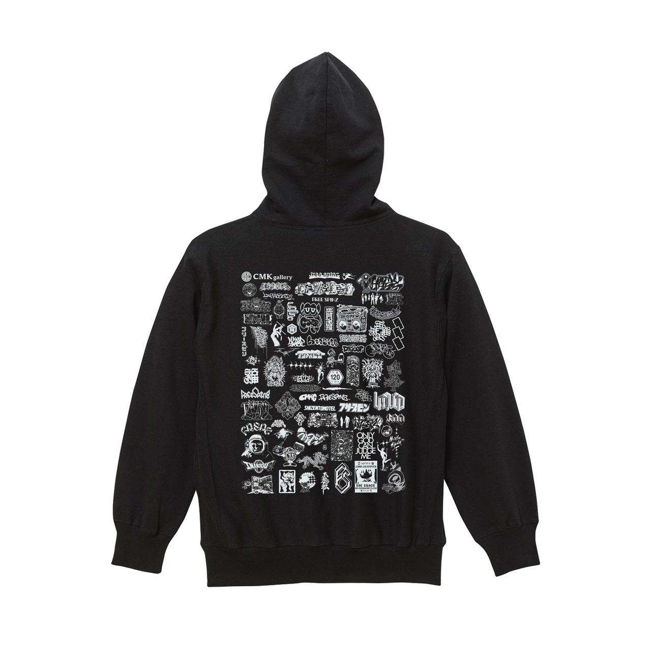 CMKGとのコラボデザインをプリントしたプルオーバーパーカー。