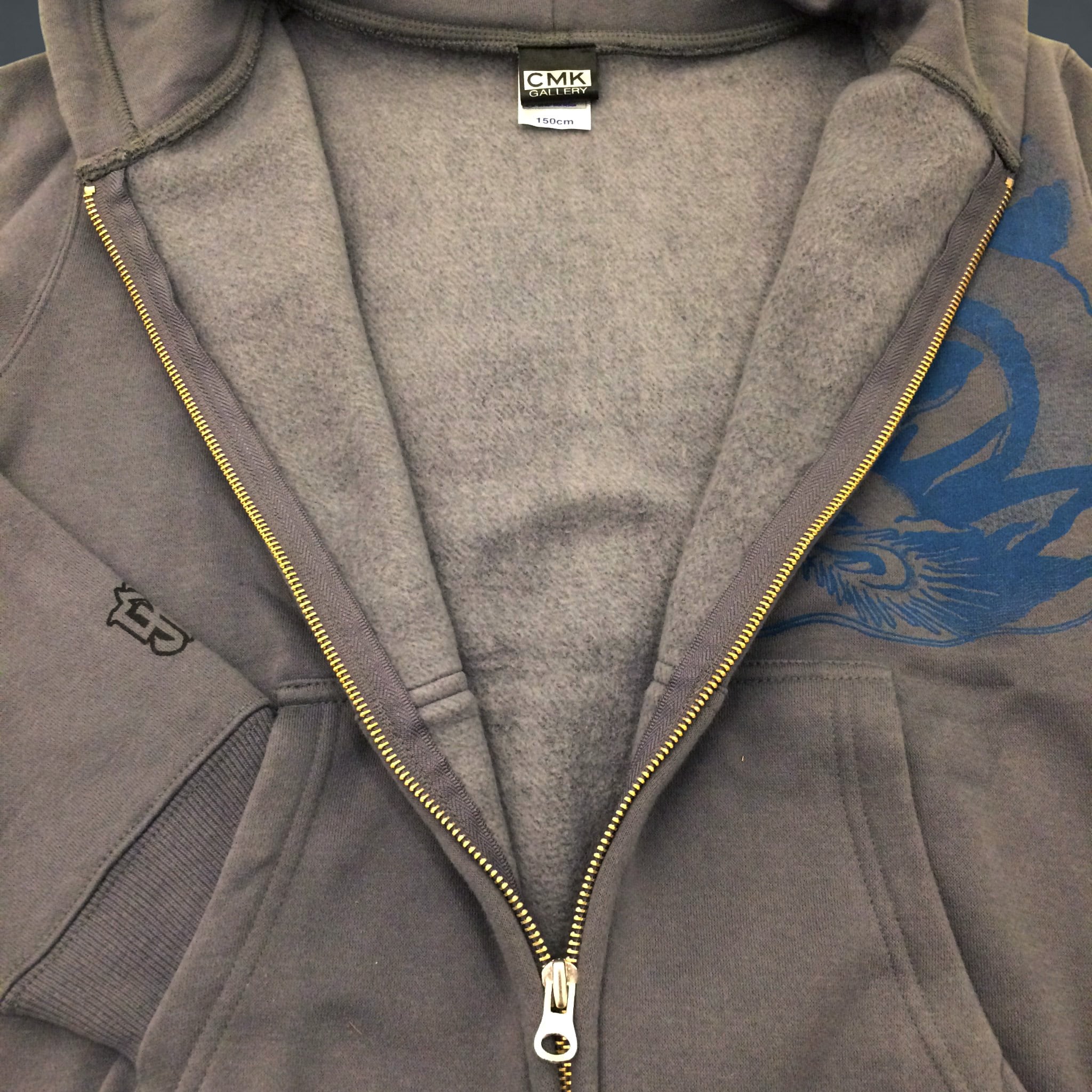 フロント左胸にJOEデザインの降り龍と背面の腰部分にはCMKGピースロゴをカラープリント、右袖口にはCASPERデザインのCMKGエンブレムをプリントしたキッズサイズのジップアップパーカー。限定1着 送料無料。