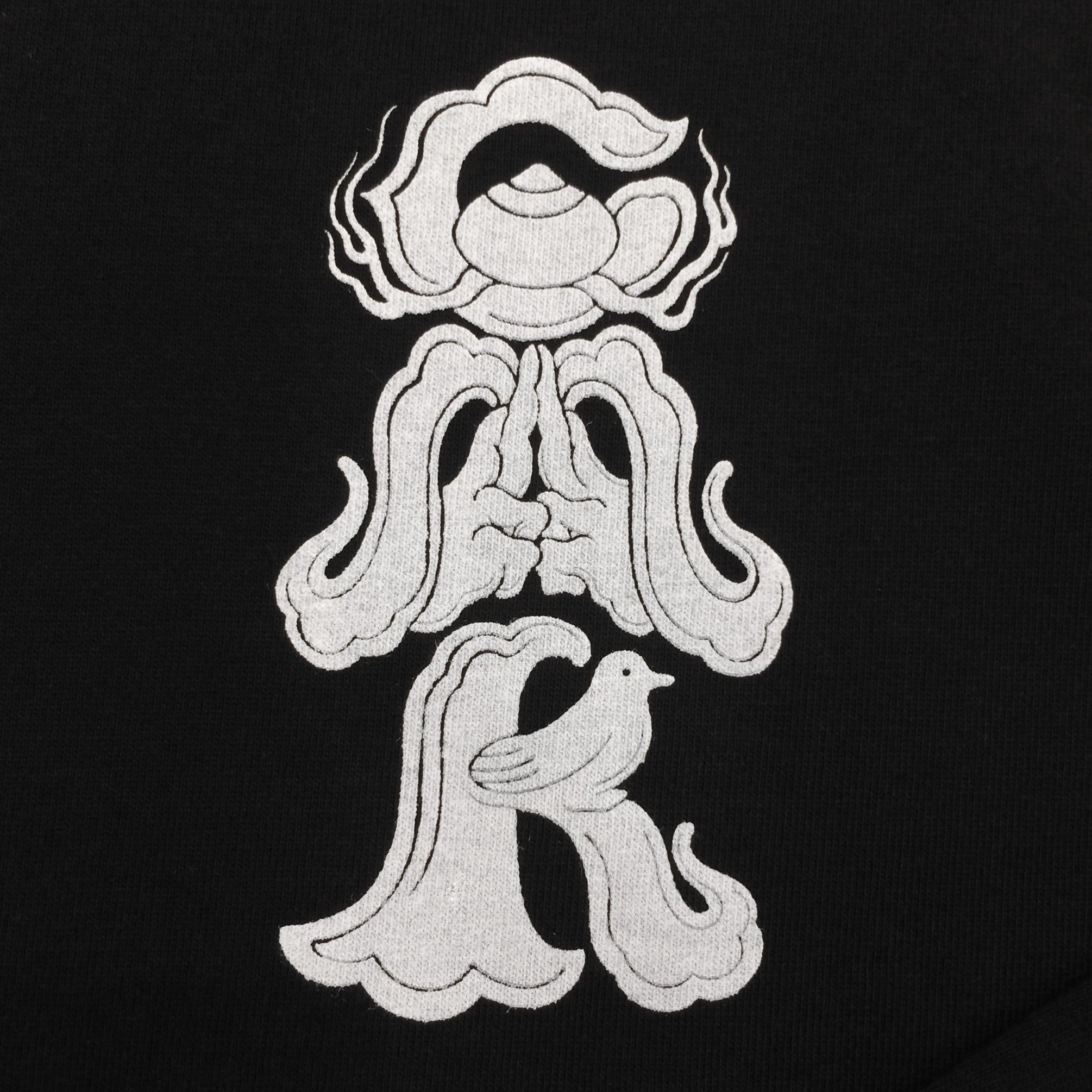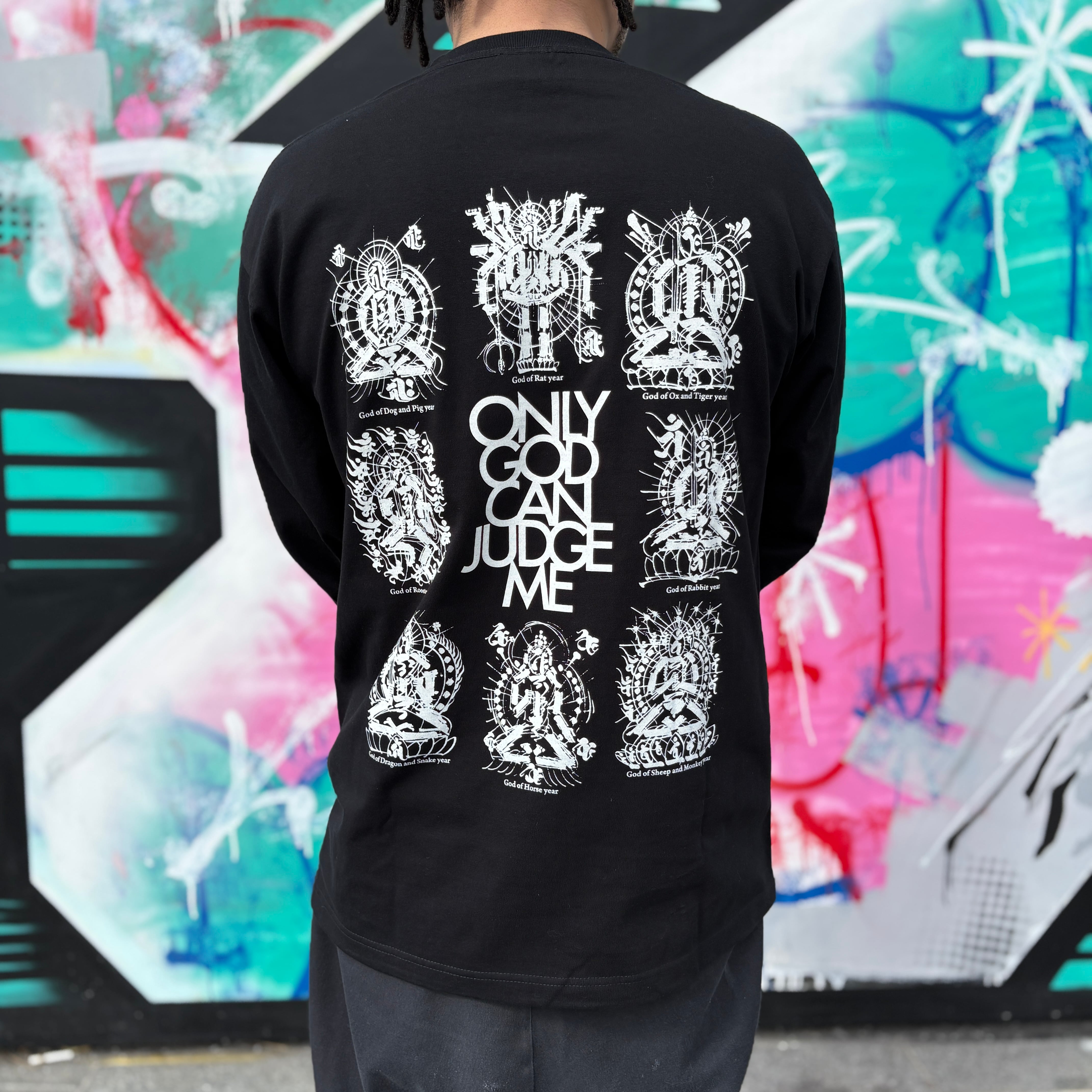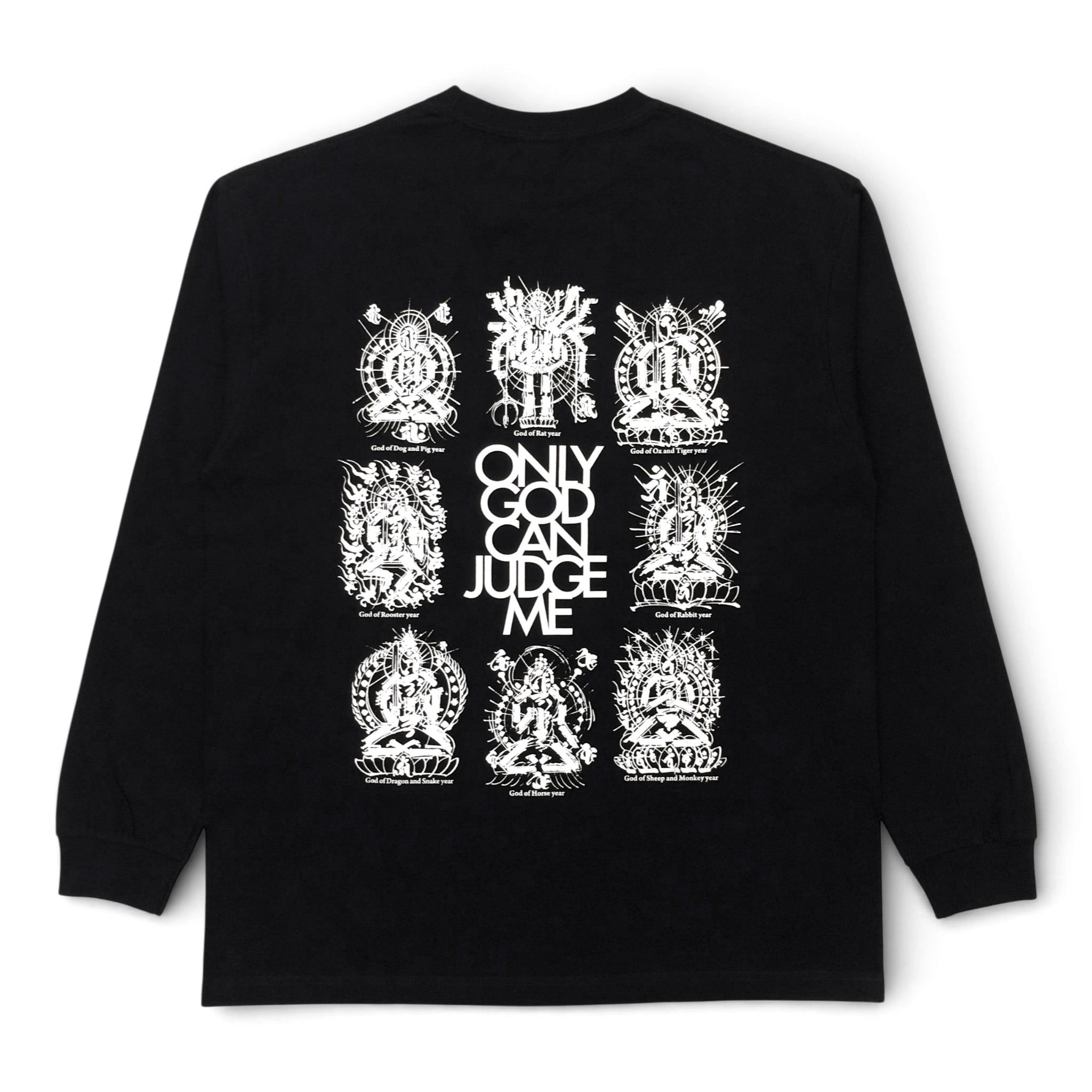 JOECMKのGOD Letter 十二支御守本尊を背面に、左胸にはCMKロゴをプリントしたロンT。十二支守り本尊は古来より"厄除けや開運の守護仏"として信仰されており、千手観音菩薩(子年)、虚空蔵菩薩(丑・寅年)、文殊菩薩(卯年)、普賢菩薩(辰・巳年)、勢至菩薩(午年)、大日如来(未・申年)、不動明王(酉年)、阿弥陀如来(戌・亥年)です。