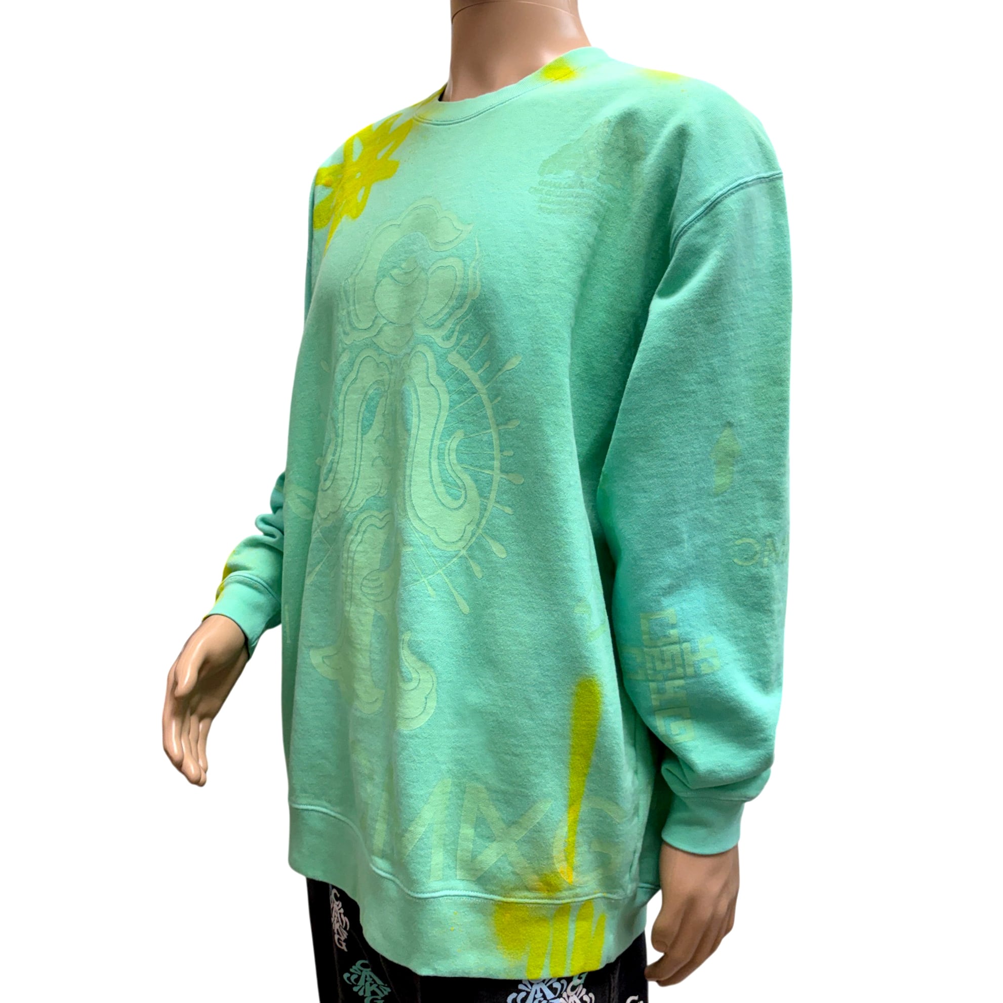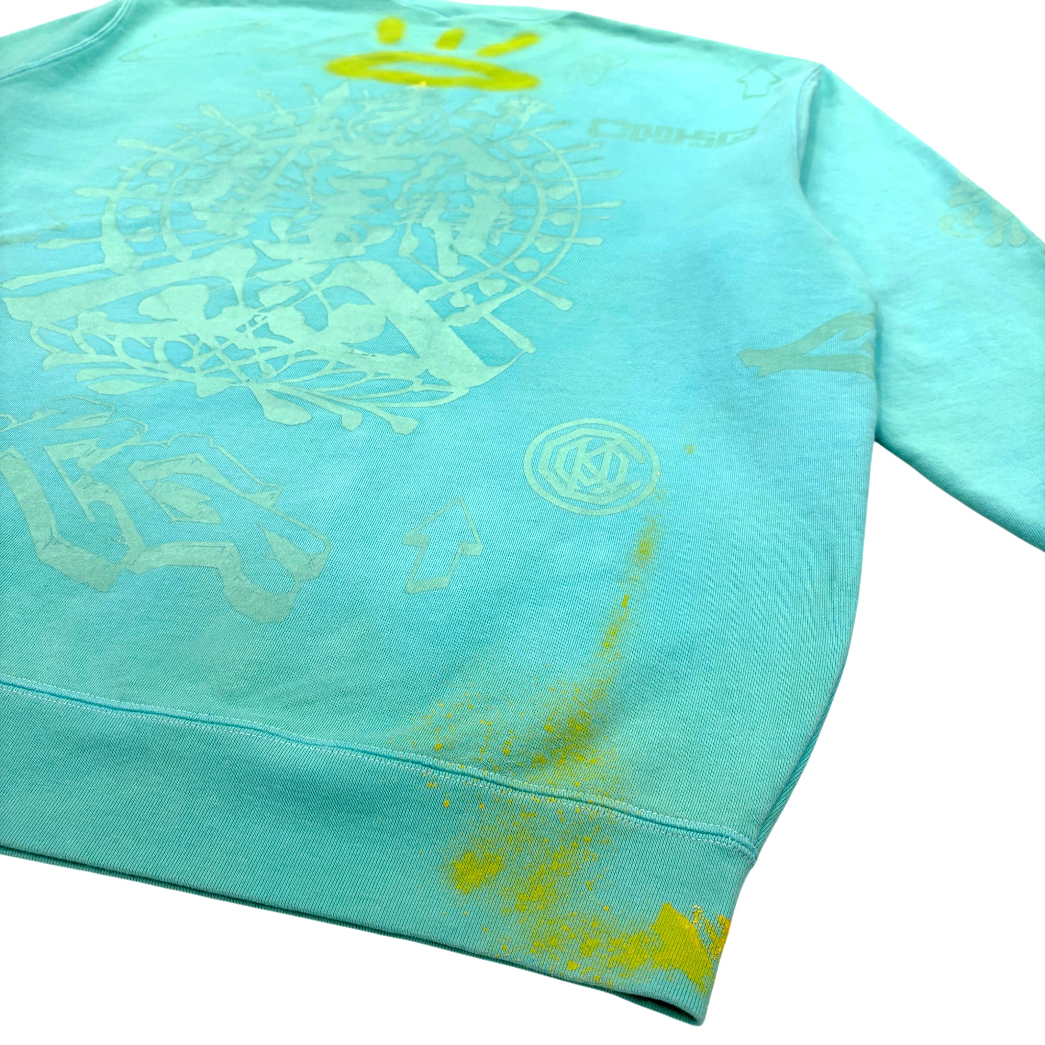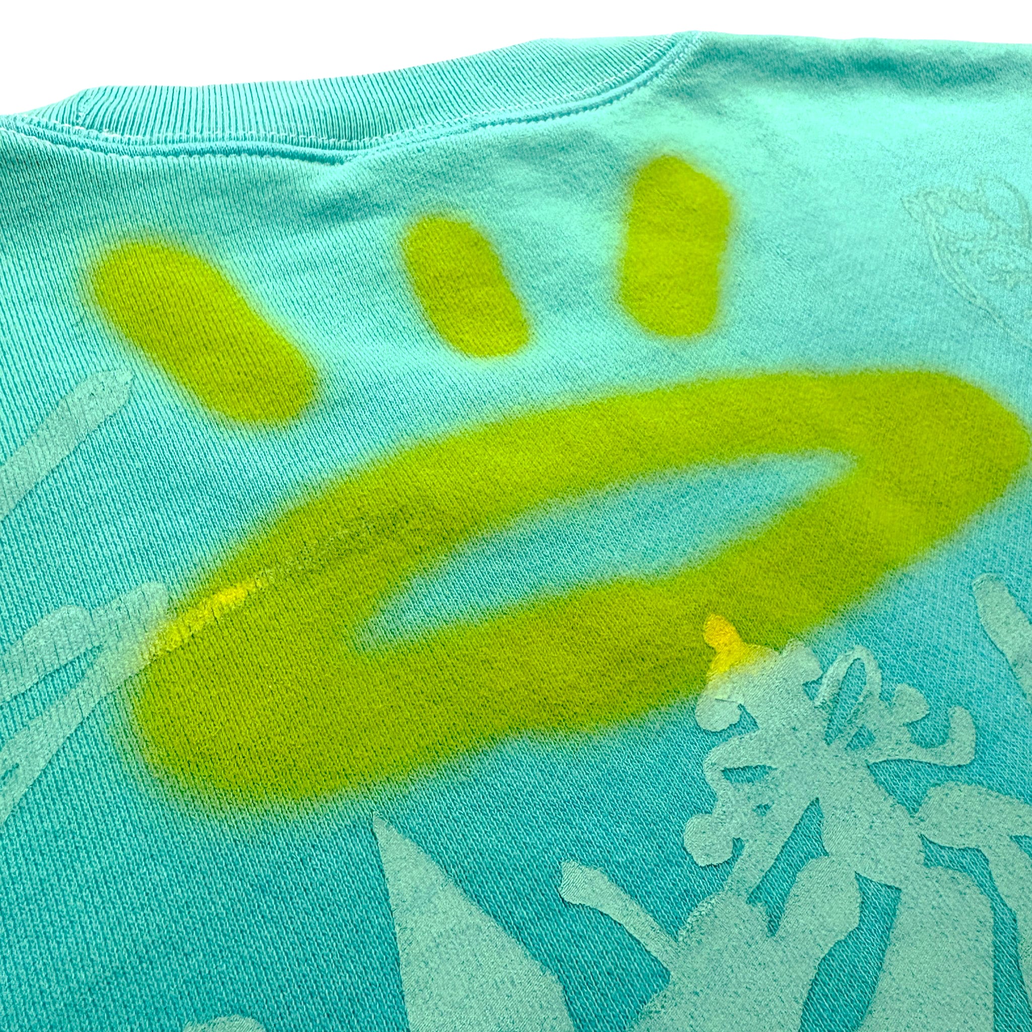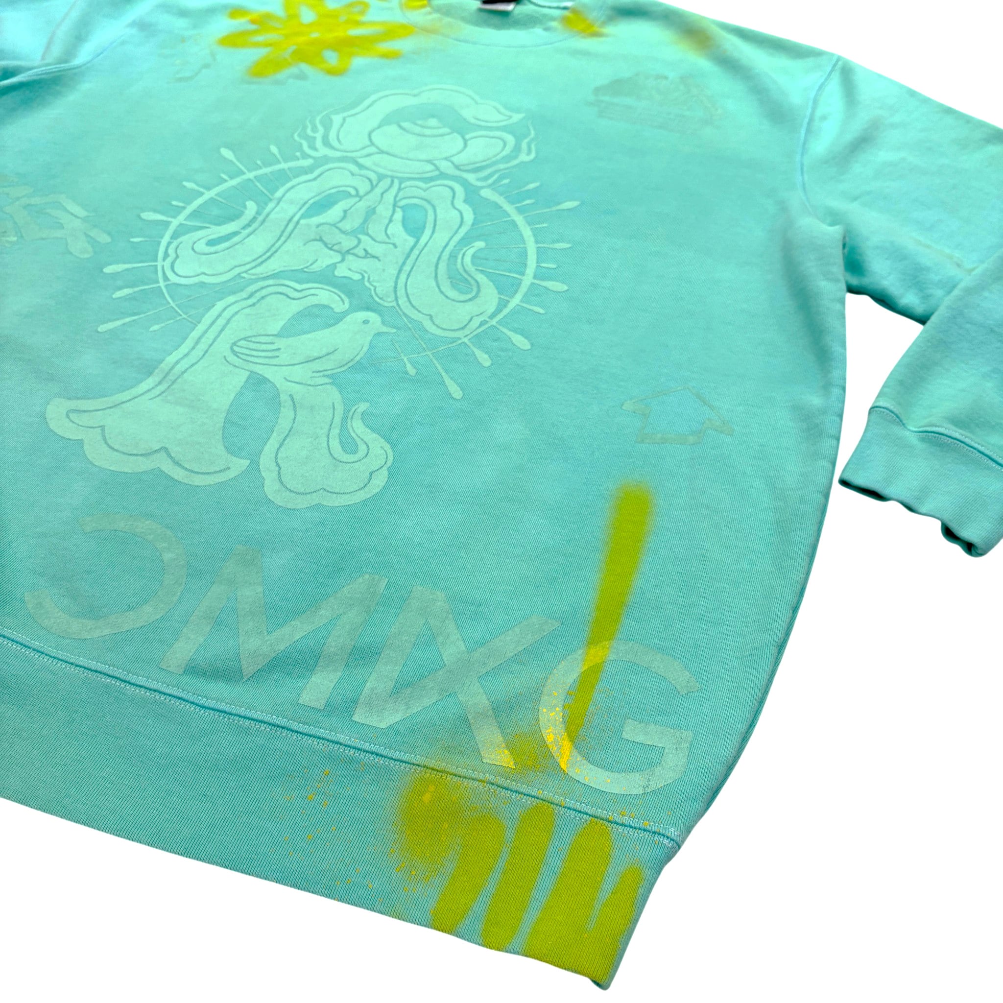 ターコイズカラーに染色加工したスウェットボディの全体に様々なデザインをバランス良くプリントし、JOECMKによるハンドペイントが施された一着。プリントカラーはボディと同色系統に拘った上品な仕上がり。裏パイル生地につき、春先にも着用可能です。