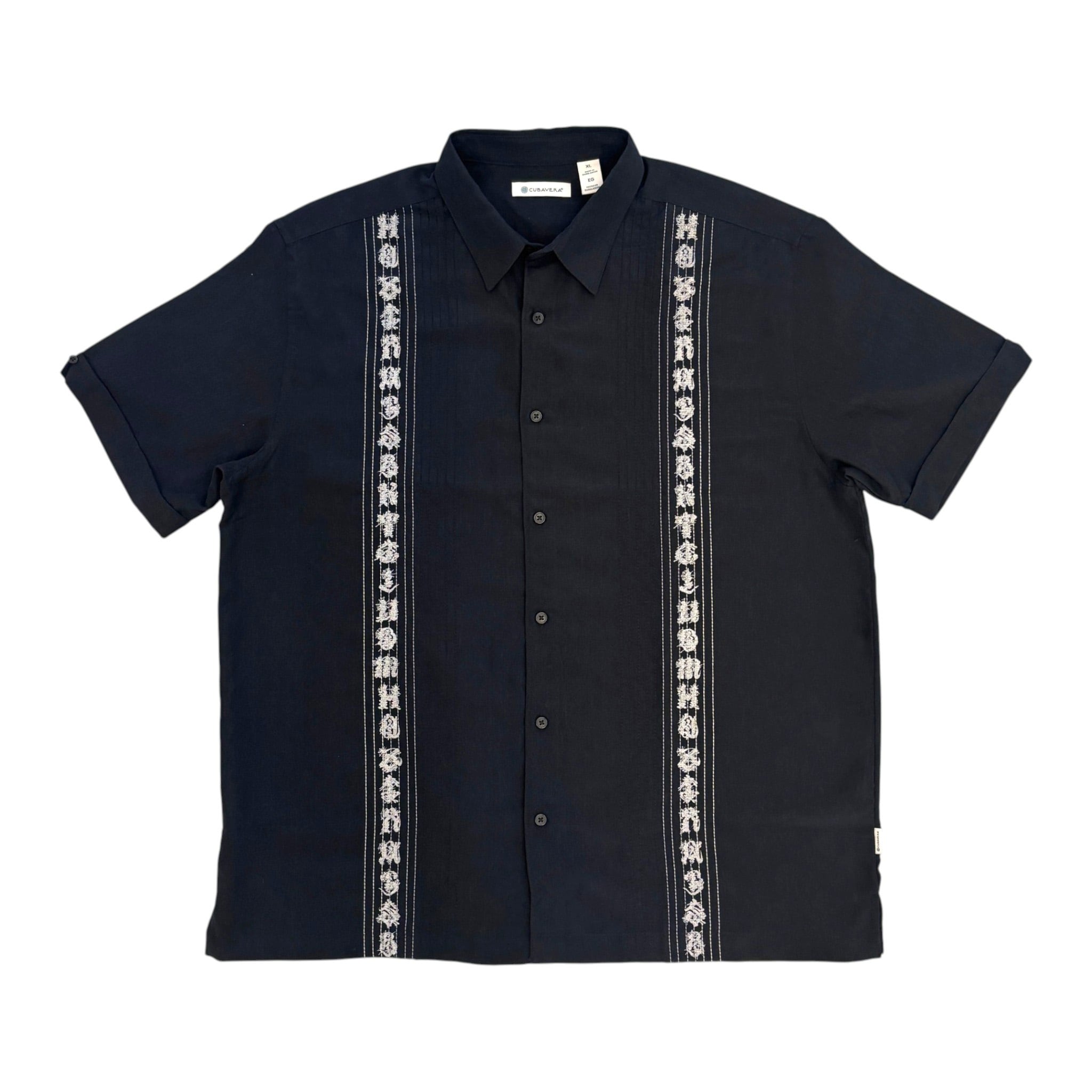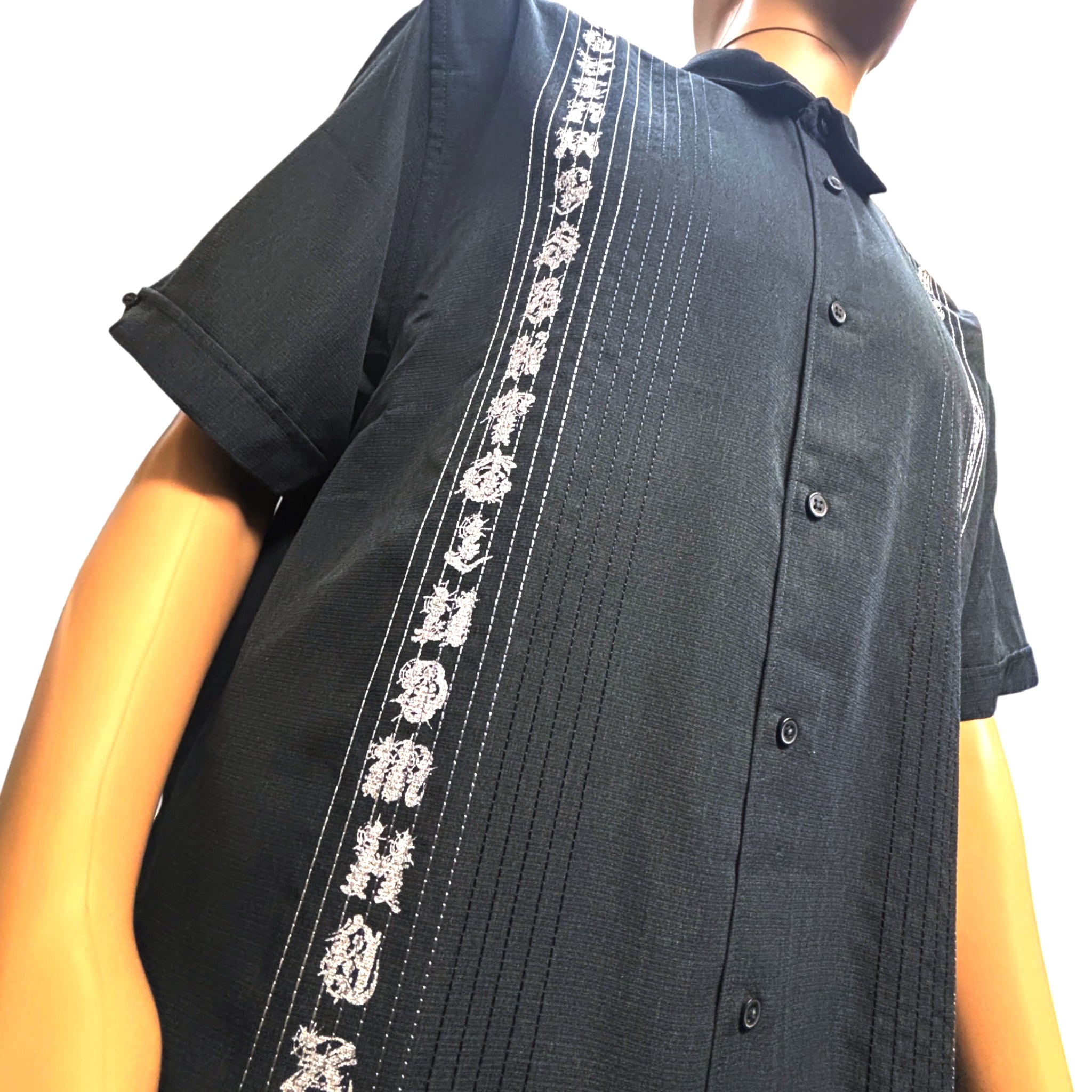 通気性の良いポリエステル混の素材で作られたCUBAVERAキューバシャツ従来のデザインに合わせJOECMKデザインの筆レターをプリント。エレガンスを保ちつつ、現代のカジュアルファッションに取り入れやすい1着。デッドストック。