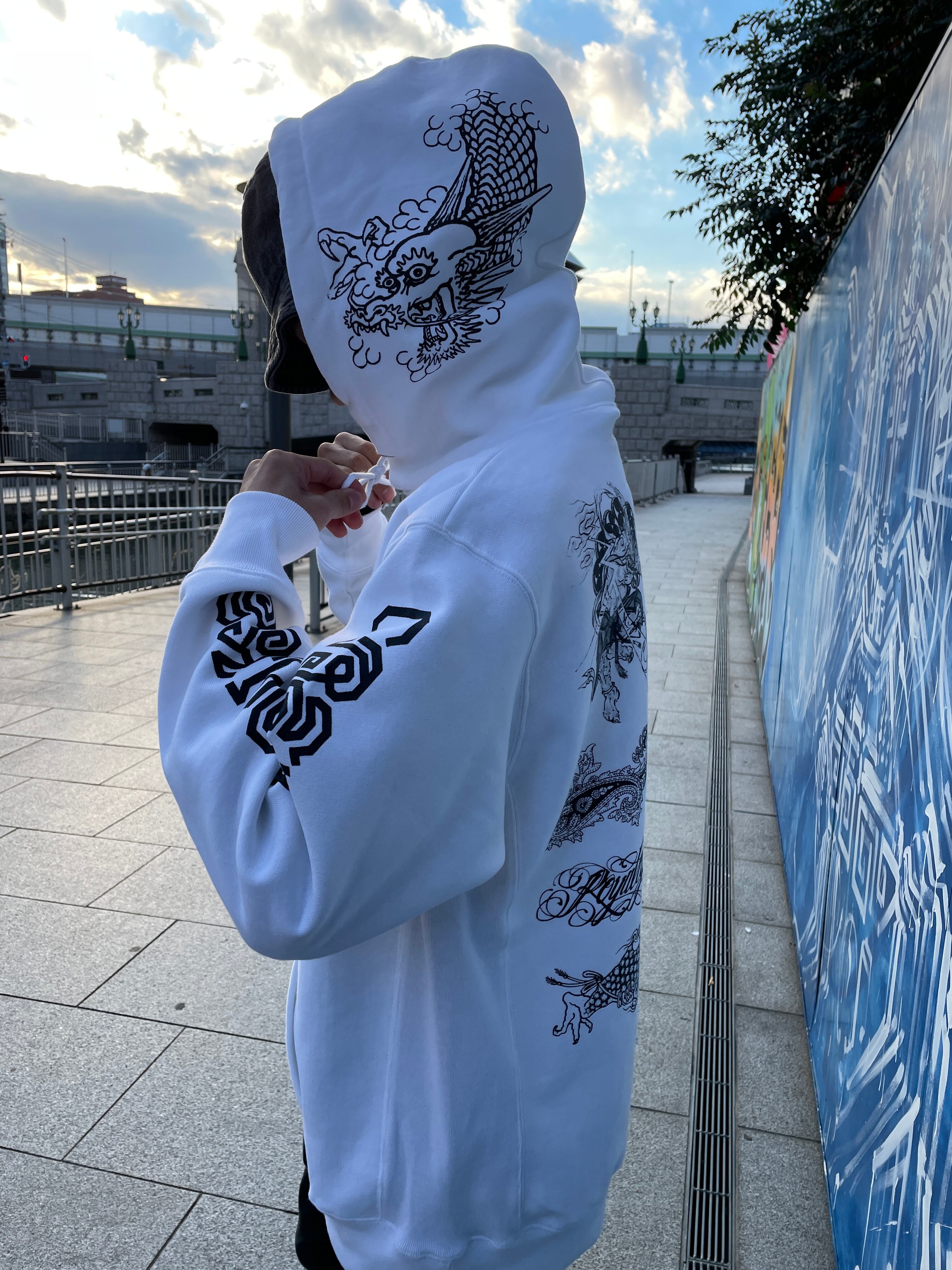 フードに手描きの降り龍、背面には風神雷神や打ち出の小槌などの伝統的な日本の絵画が落とし込まれています。