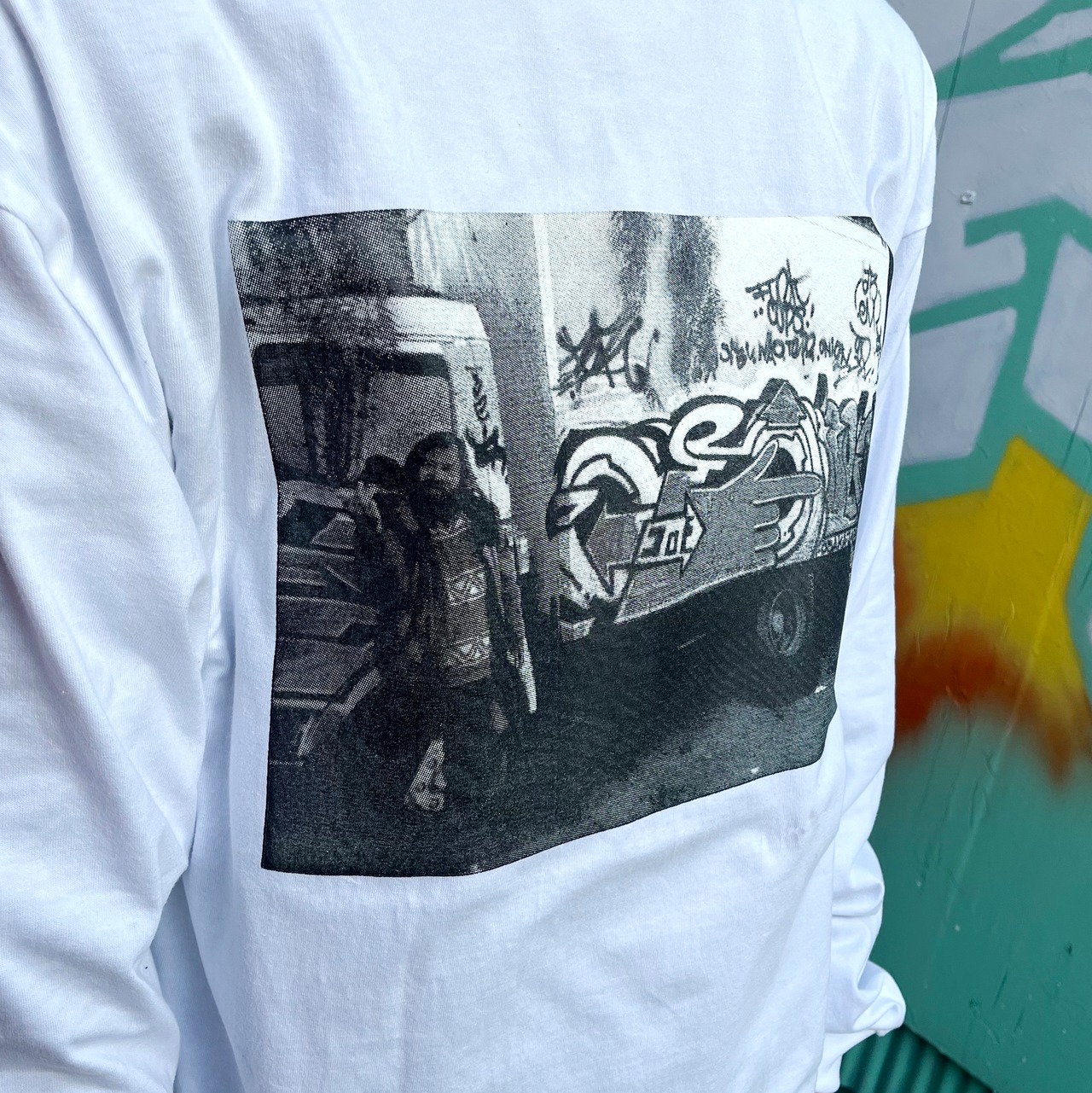 ホームレスの住むトラックに描いたピースショットをプリントした一着。