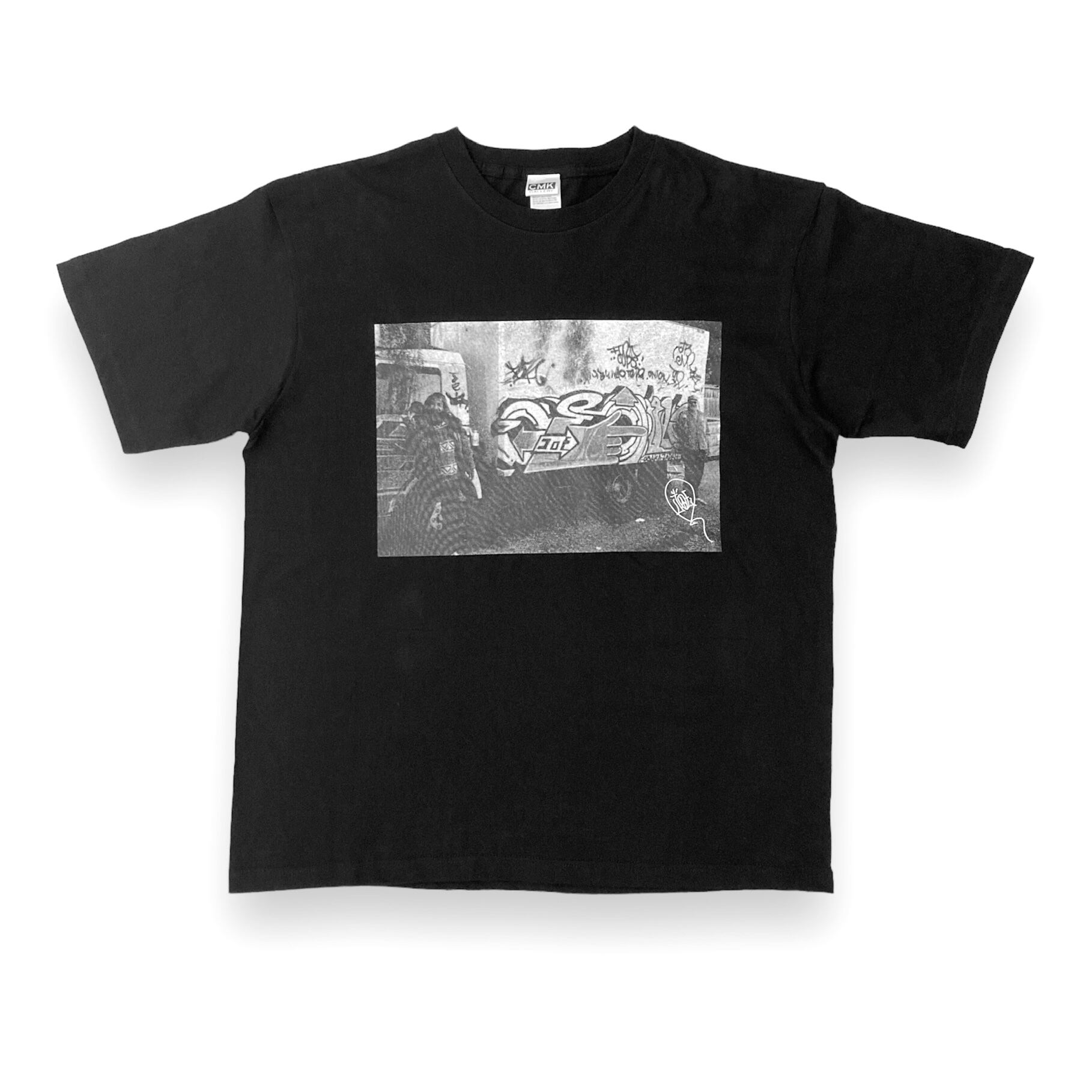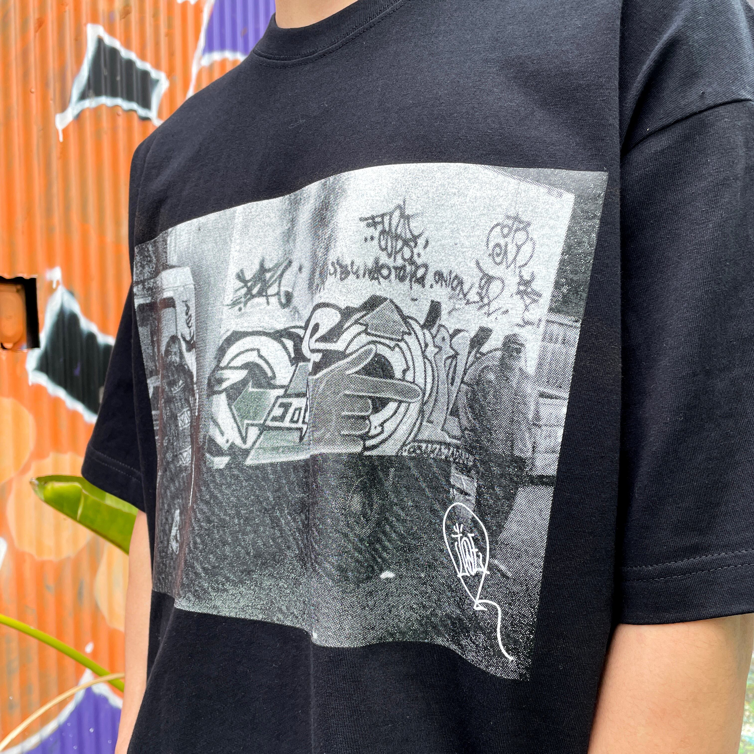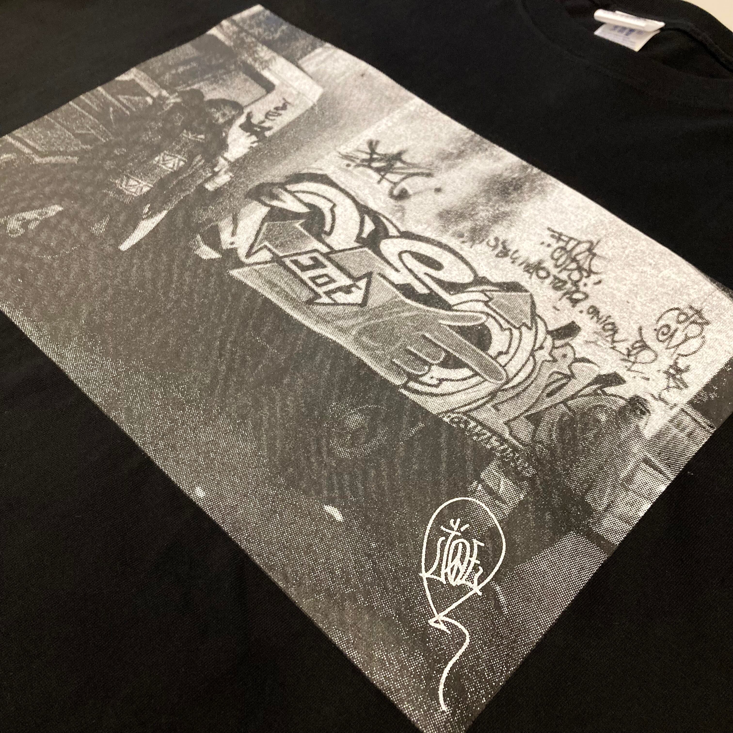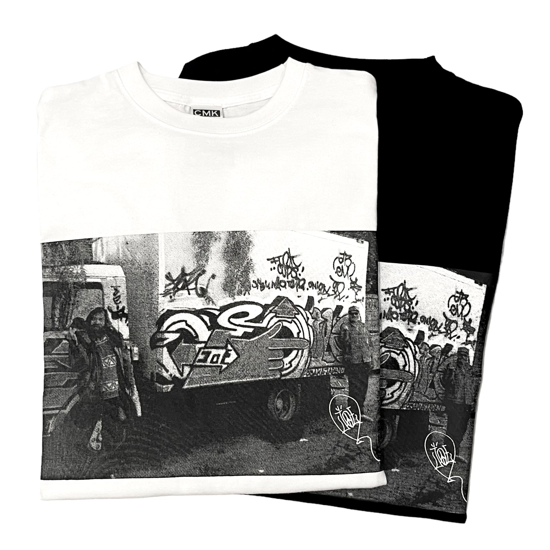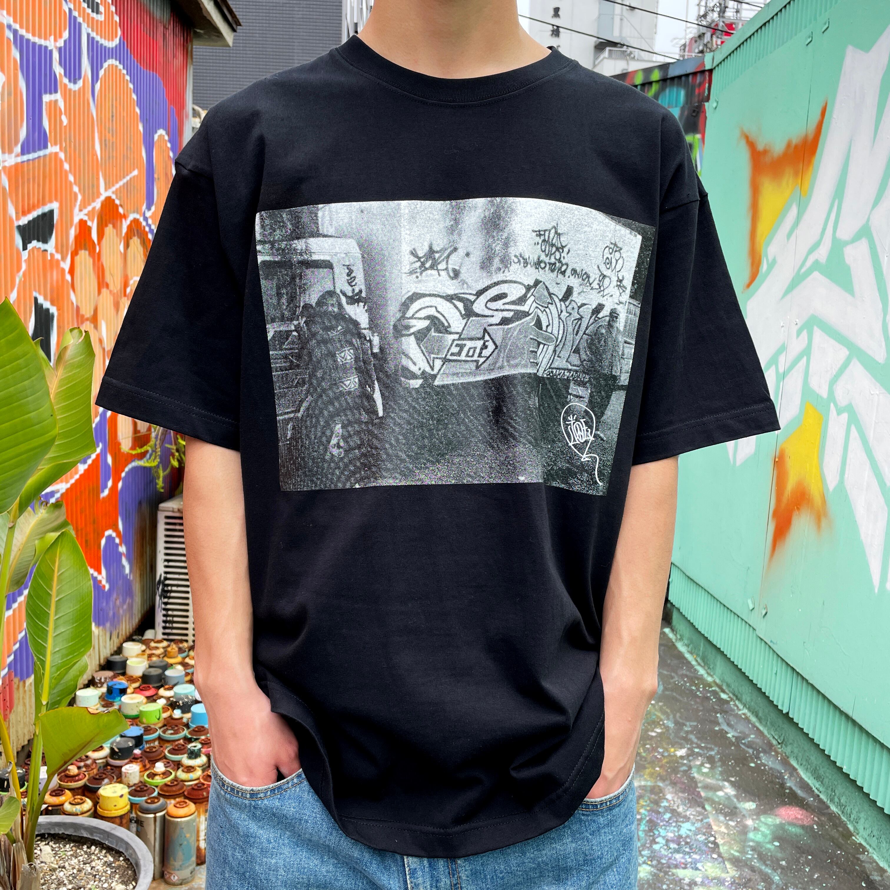 ホームレスの住むトラックに描いたピースショットをプリントした一着。