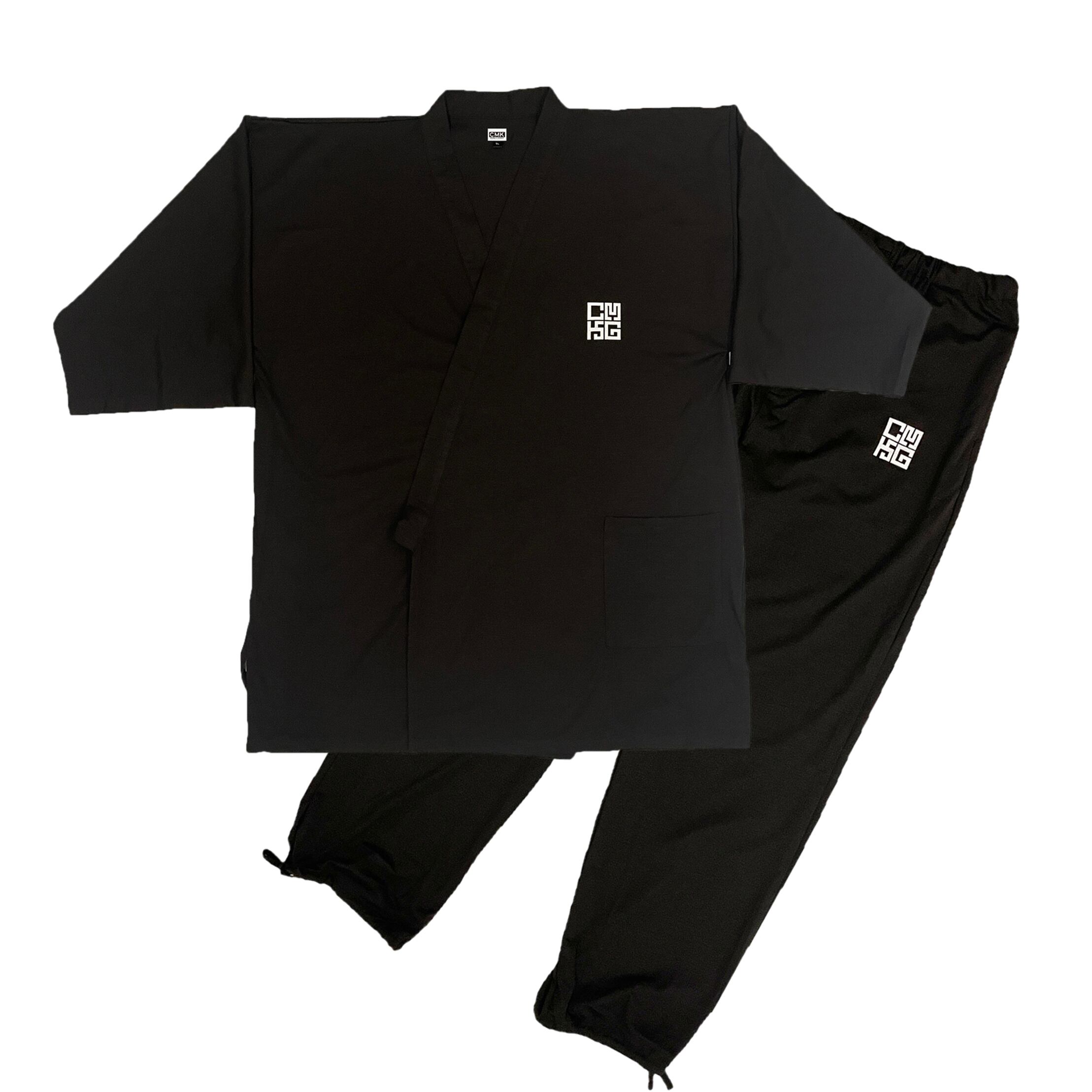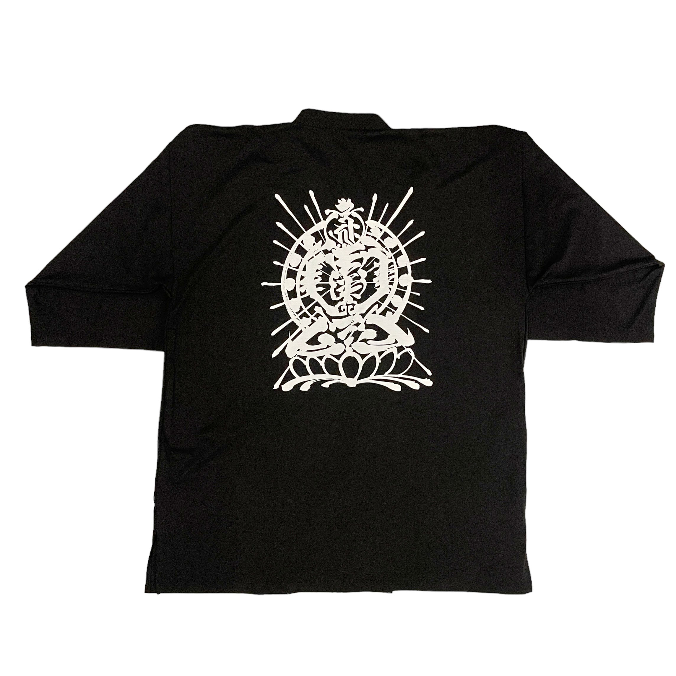 バックにはJOEによるGODletter "阿弥陀如来"をプリントした通年用の作務衣。