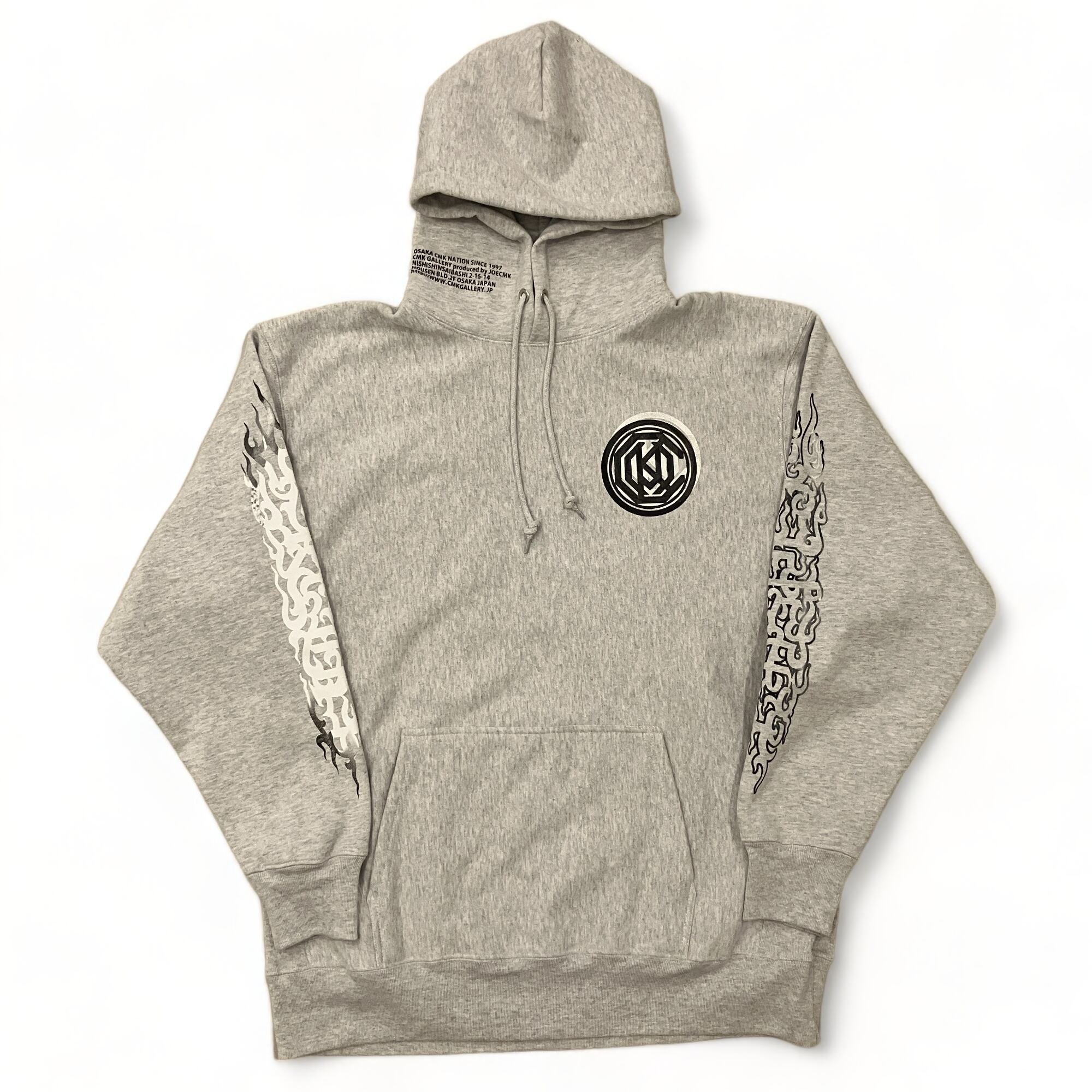 背面にCasperのハラペコデザインをブラックとホワイトで大胆にプリントし、両袖にレタリング、左胸にCMKGロゴ、フード部分にCMK galleryのアドレスをプリントした盛り沢山な一着。