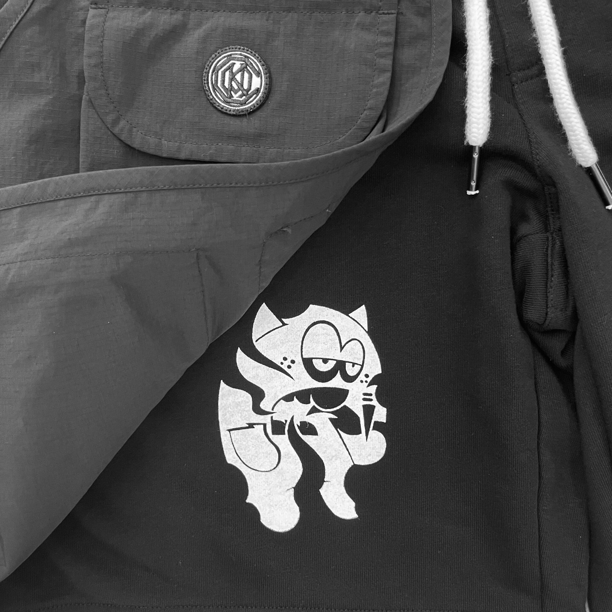 スウェット生地のハーフパンツに別素材の収納ポケット部分をドッキング。