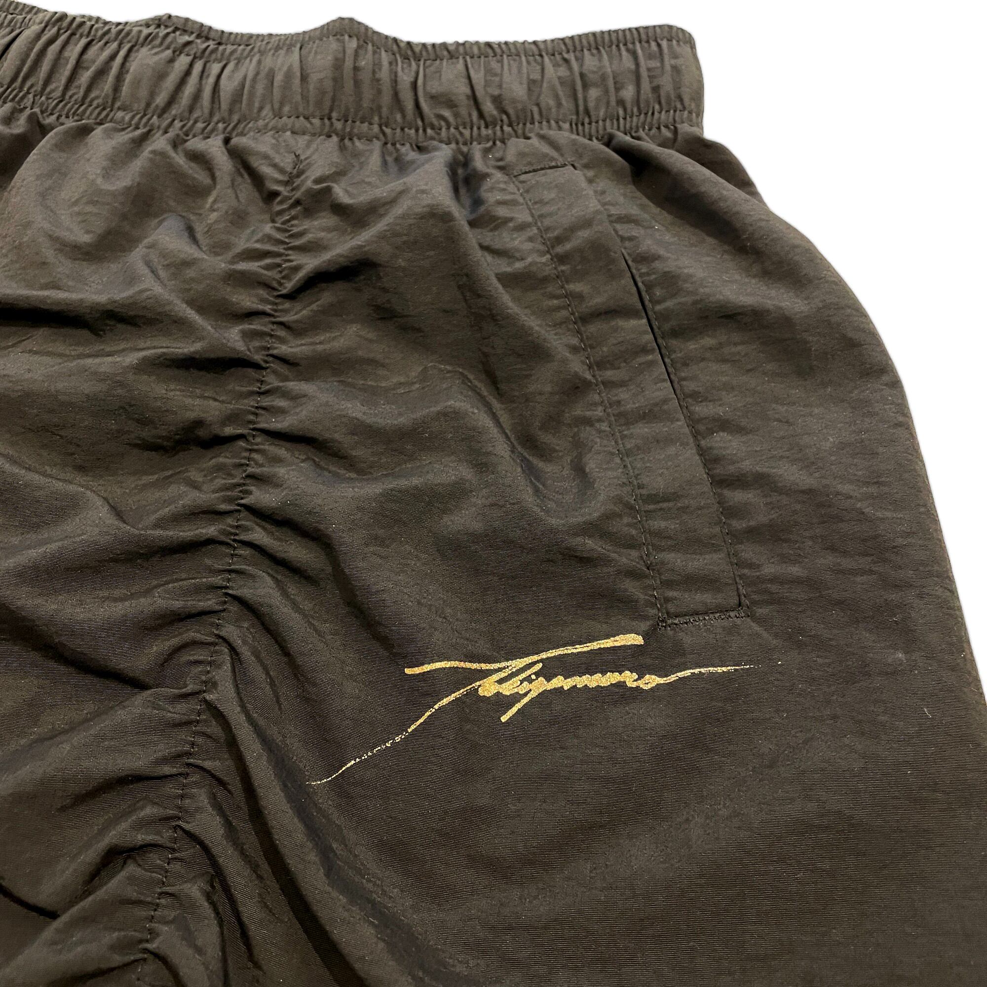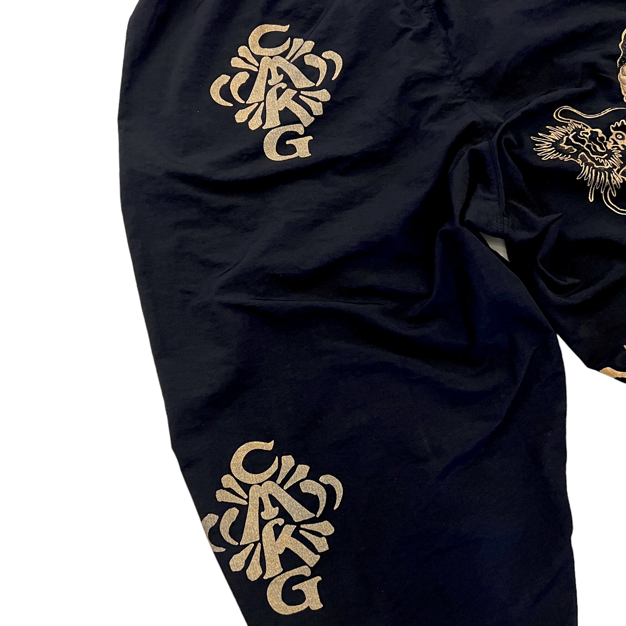 Takizomoroの「降り龍」と「GOD letter 虚空蔵菩薩」、「CMKGクロスロゴ」をゴールドインクで大きくプリントしたナイロンパンツ。