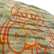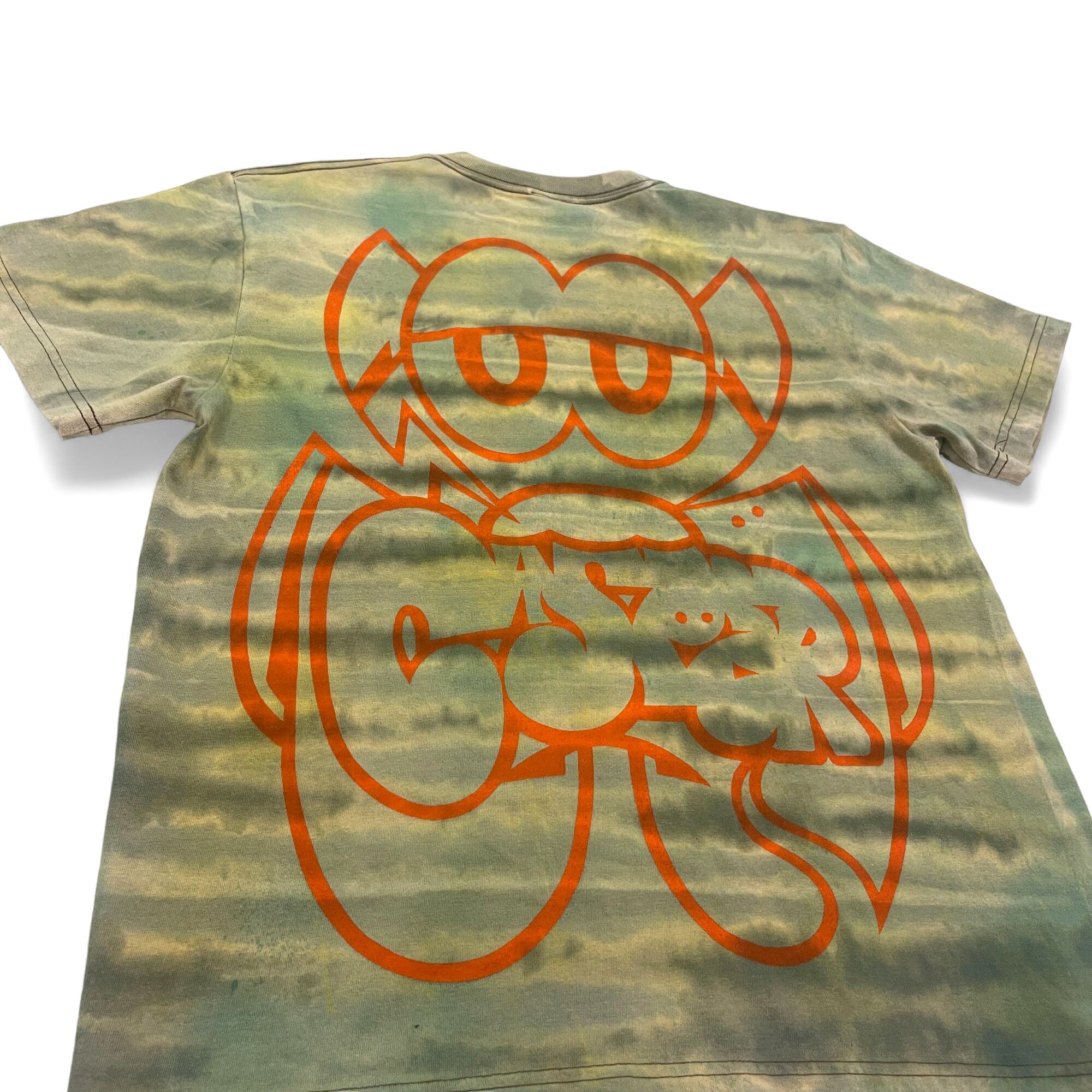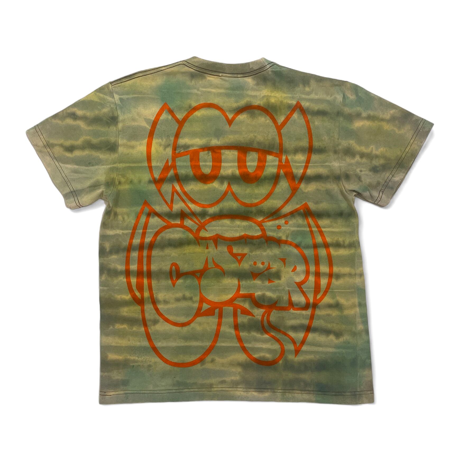 森林をイメージしブリーチ、染色加工したボディーの前面にCASPERレター、背面にハラペコCASPCHANを鮮やかなオレンジ色でプリントした1着。