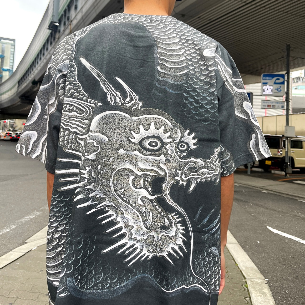 所属アーティスト JOEの絵画作品「八方睨み龍」を背面総柄に落とし込んだ大胆な一着。