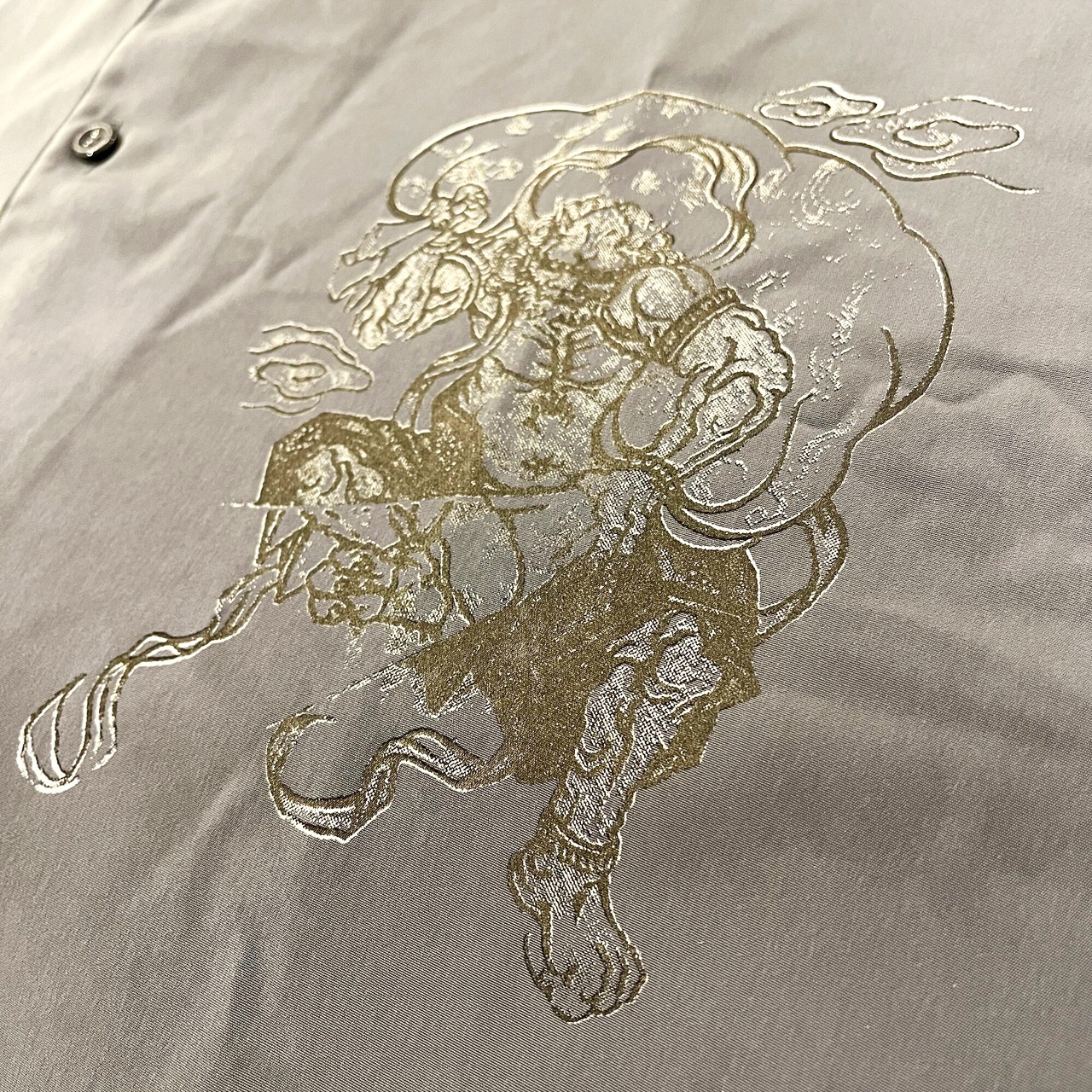涼しさを感じるなめらかな肌ざわりと絶妙なサイジングの肩落ちシルエットの開襟シャツに、フロントにJOEの風神雷神をプリントし、バックはワンポイントでJOE ”GOD Letter虚空蔵菩薩"をプリントした一着。