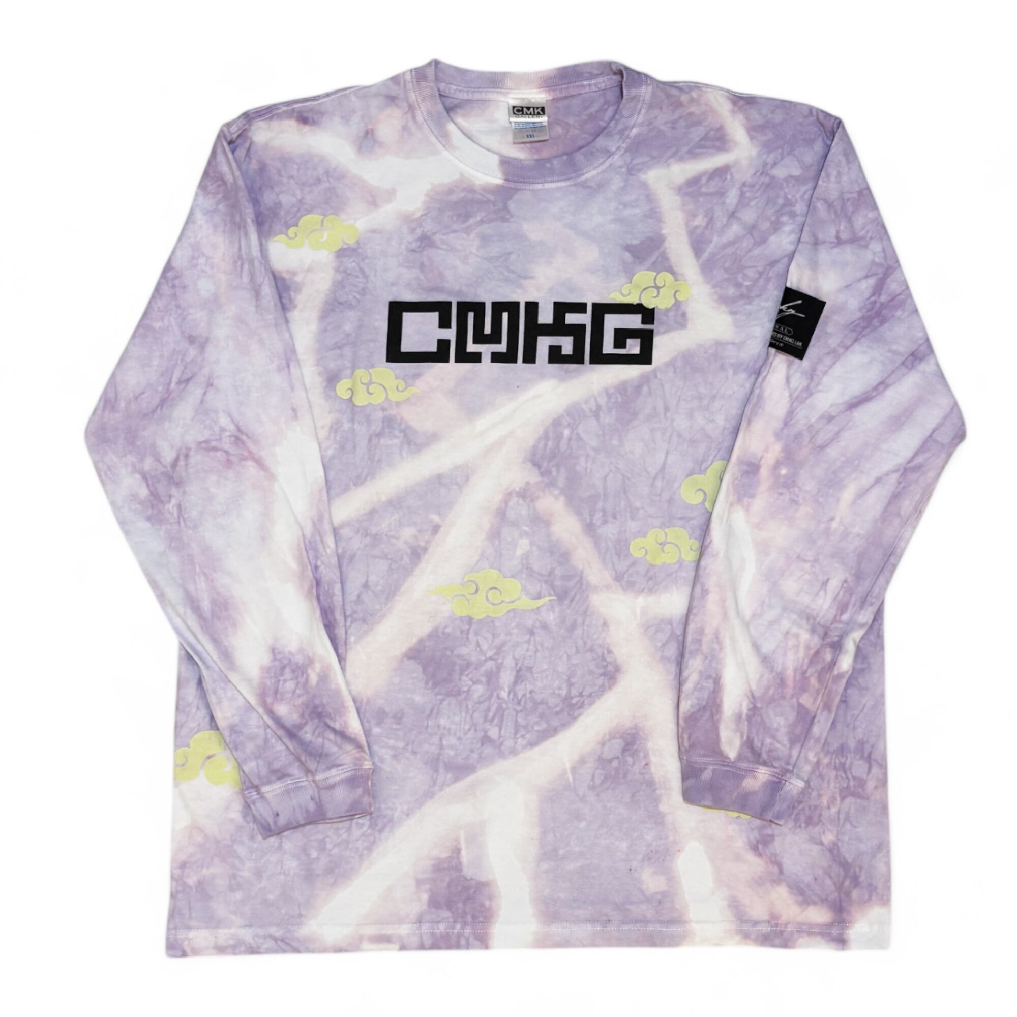 稲妻模様に脱色したボディの全体にバランスよく雲柄をプリントし、