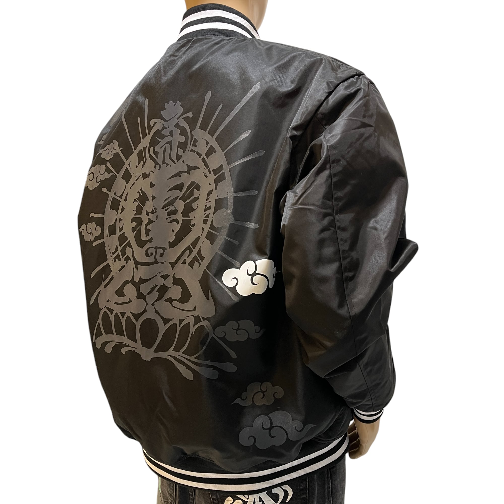 ブラックボディのスタジャンにJOEのGOD Letter阿弥陀如来と雲模様をダークグレイでプリントし、リブ部分とリンクしたホワイトをアクセントに取り入れた