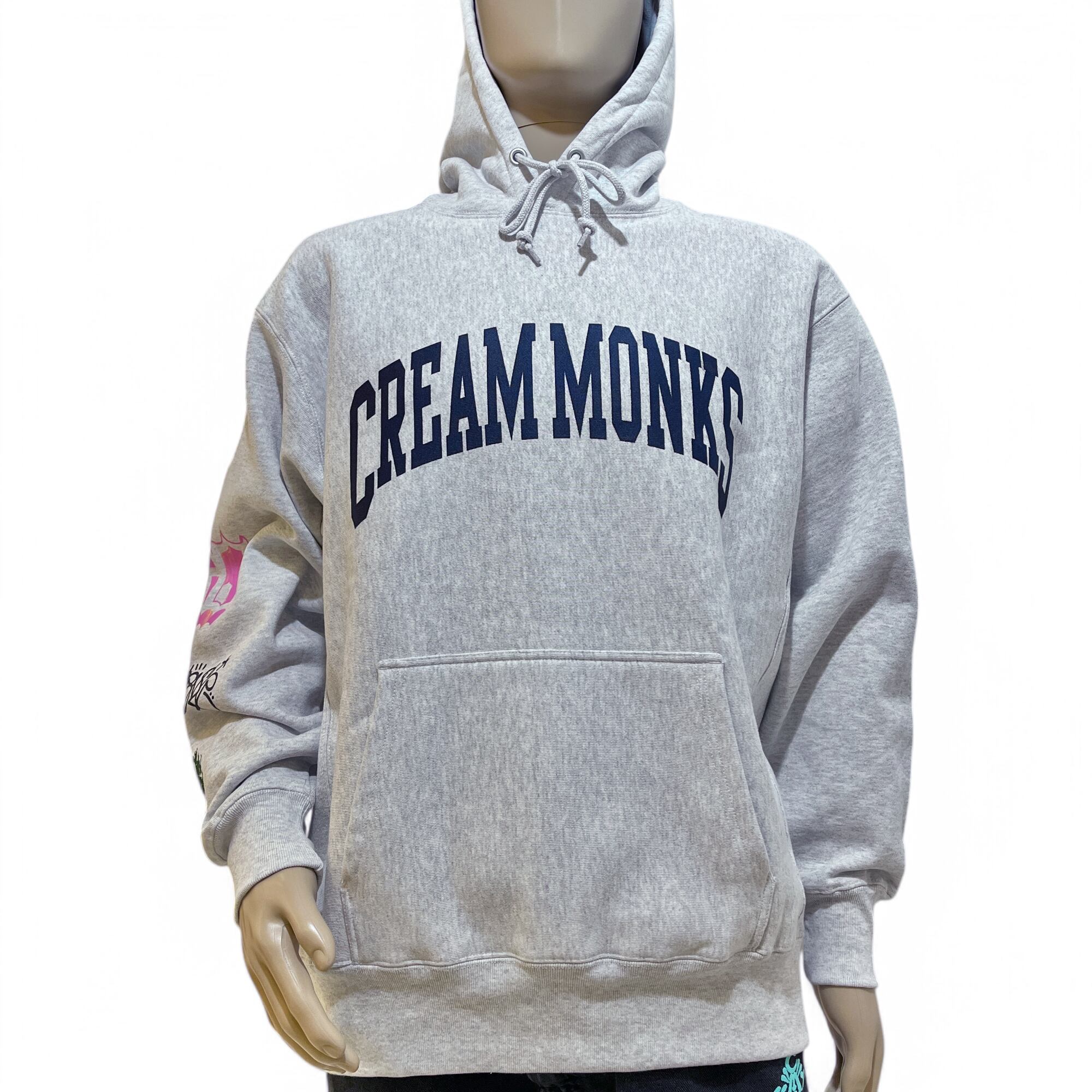 アッシュカラーのパーカーに、カレッジスタイルロゴが大きくデザインされています。