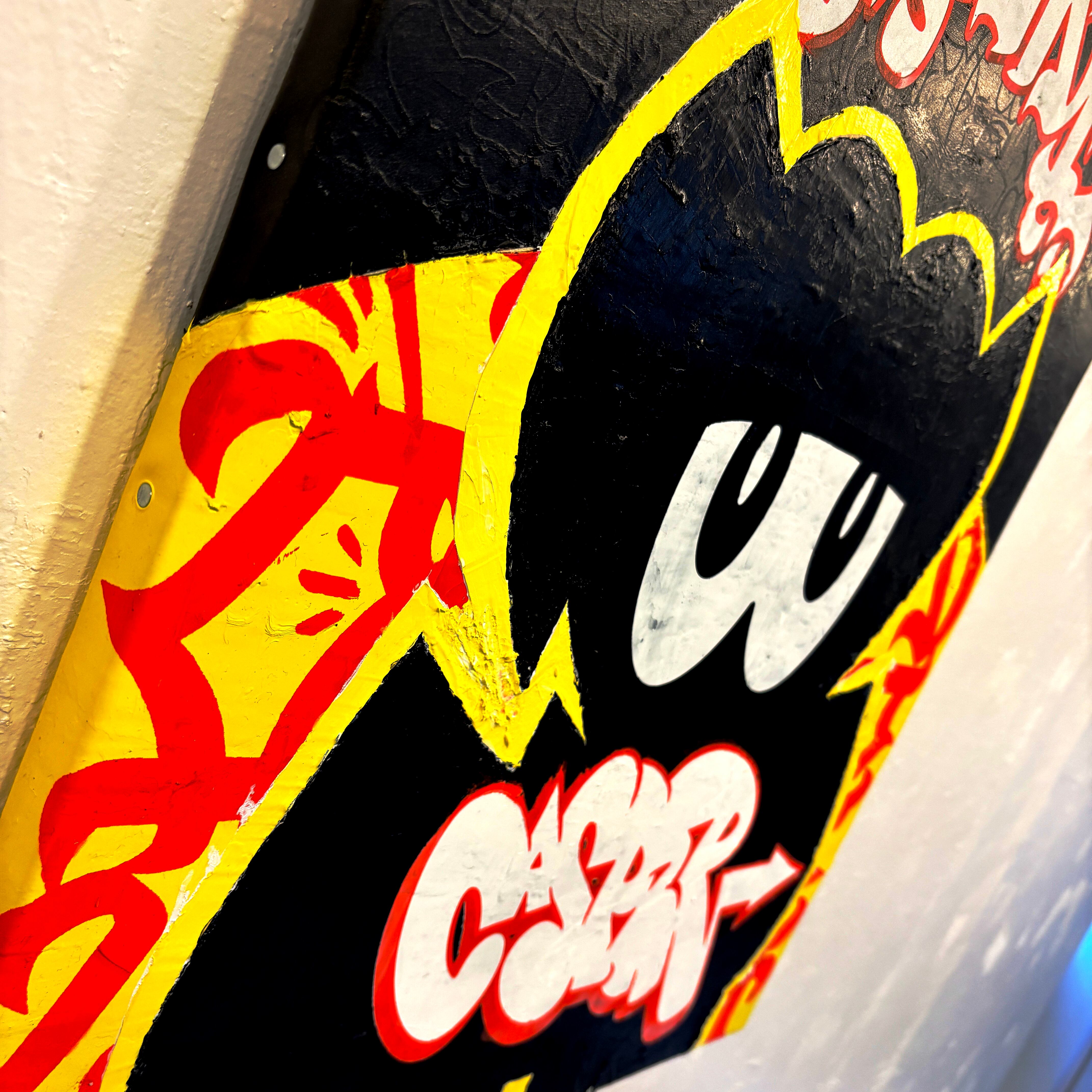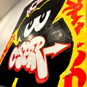 様々なデザインを組み合わせたシルクスクリーンプリントによるキャンバス作品。